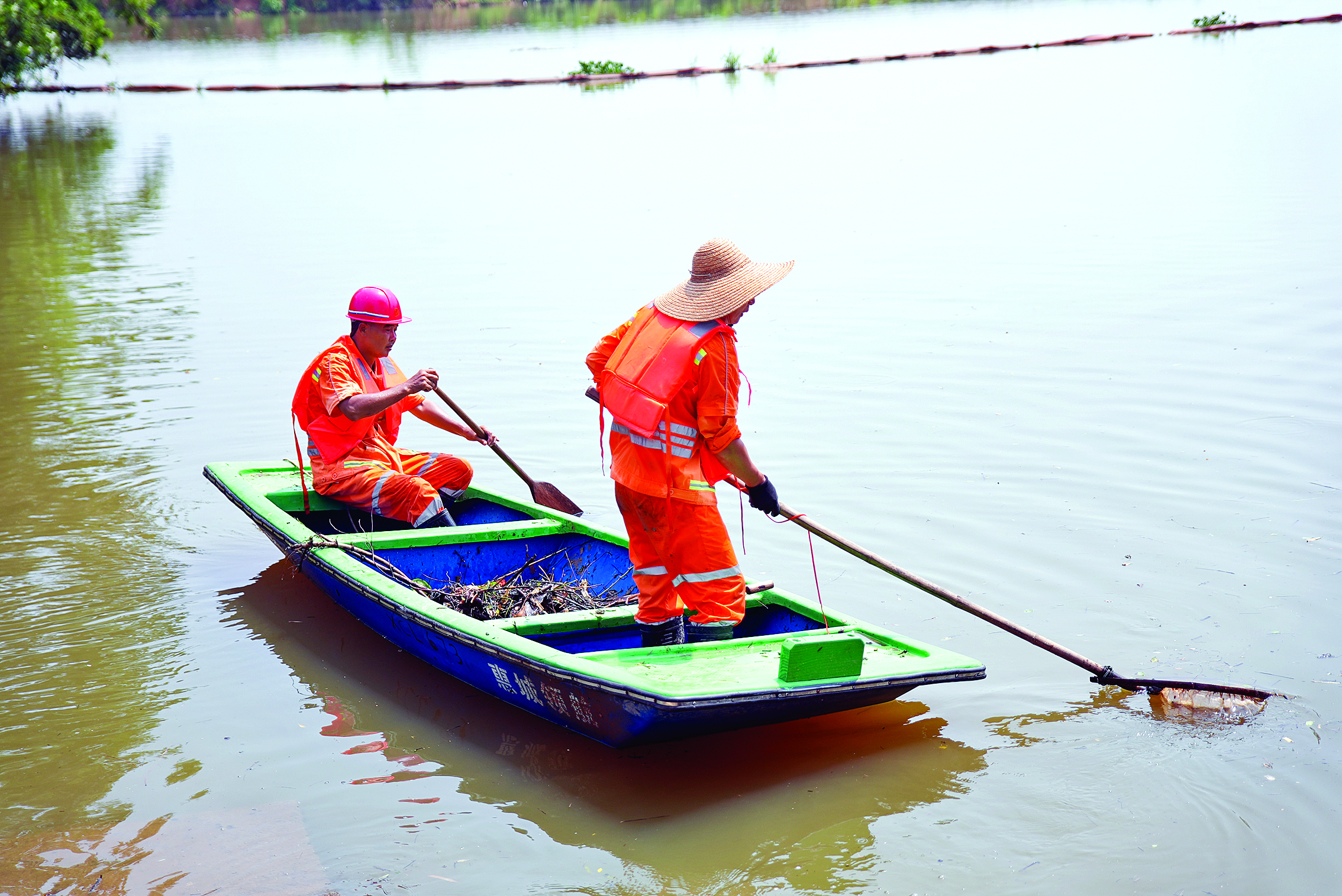 兩名環(huán)衛(wèi)工人身著救生衣在小船上清理三棟木瀝河中的垃圾。惠州日報記者羅劍業(yè) 攝