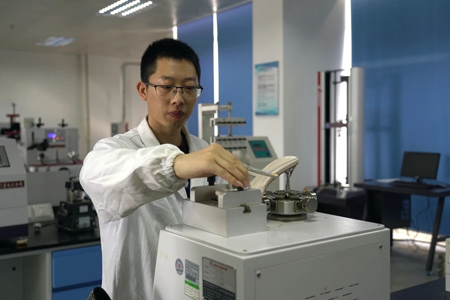 在該中心實驗室,檢測人員把一雙鞋子的鞋底開了5毫米的口子,然后放到機器上做整鞋耐折性實驗,“機器自動折疊鞋子4萬次,看它會不會斷裂!痹撝行呢撠熑藙㈧辖榻B,該中心是全國第五家國家鞋檢中心,服務項目有290項,可為鞋企提供從產品研發(fā)、原材料把關到終端產品質檢等全過程、全產業(yè)鏈的第三方高端檢測技術服務,且可無紙化受理企業(yè)送來的樣品,中心檢測完后出具電子報告,企業(yè)在系統(tǒng)里自行打印即可,“一次都不用跑。”