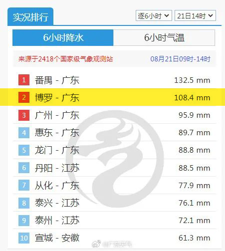 在21日14時(shí)過(guò)去6小時(shí)全國(guó)雨量榜中,