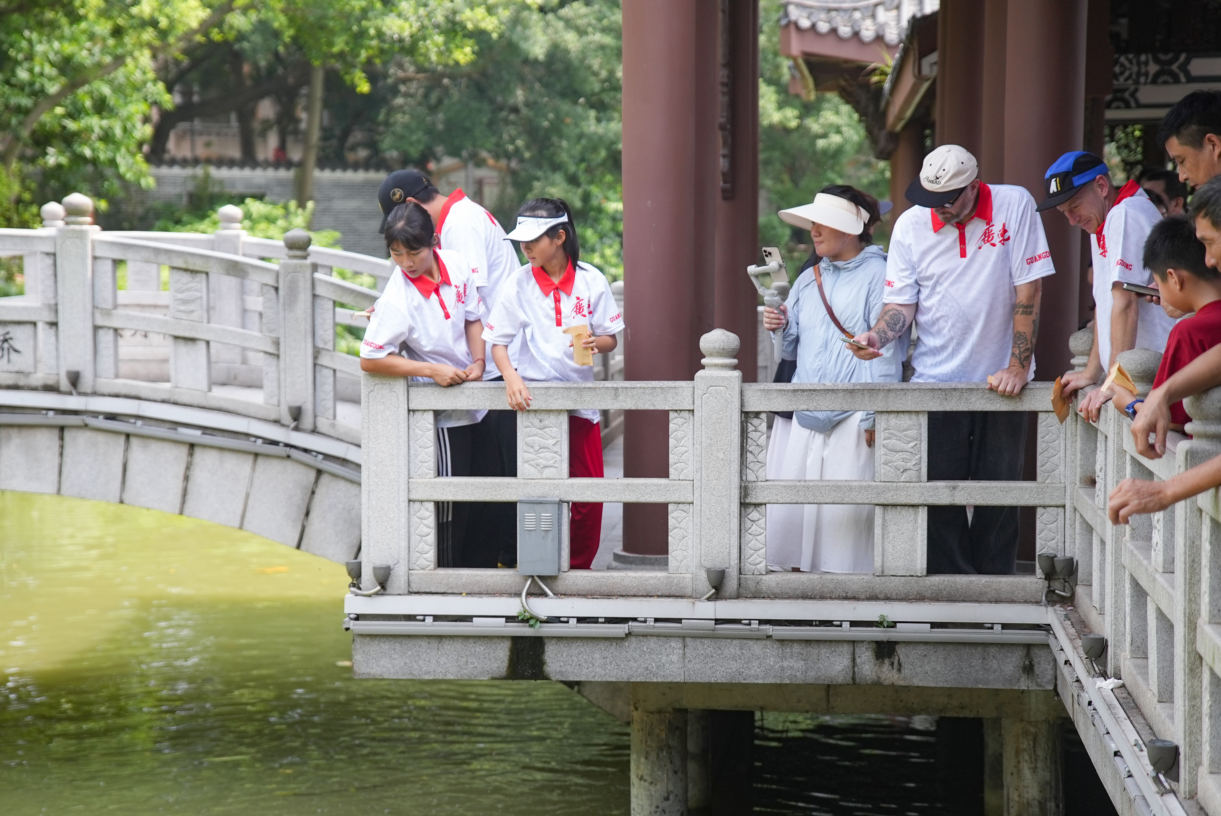 奧運健兒們在豐渚園喂魚。惠州日報記者羅劍業(yè) 攝