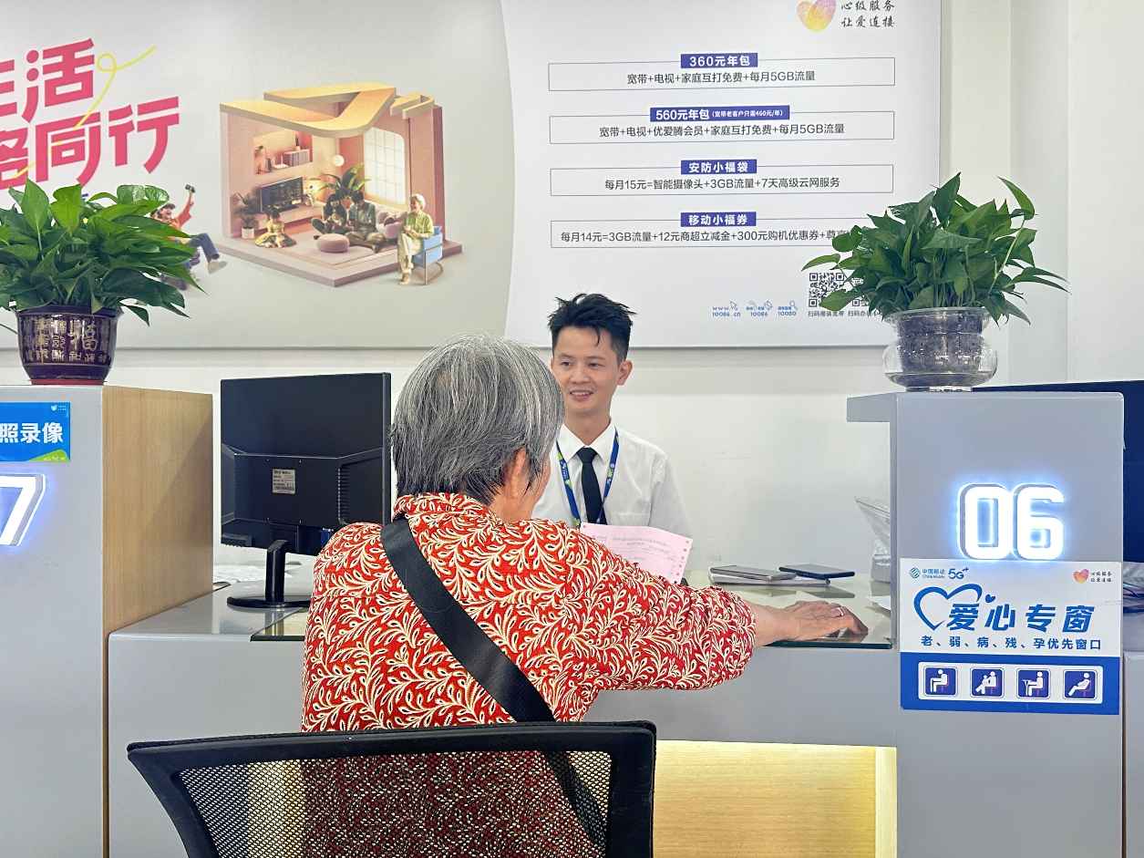 廣東移動(dòng)惠州惠城分公司在營(yíng)業(yè)廳設(shè)置“愛(ài)心專窗”,為老、弱、病、殘、孕等特殊群體開通“綠色通道”。