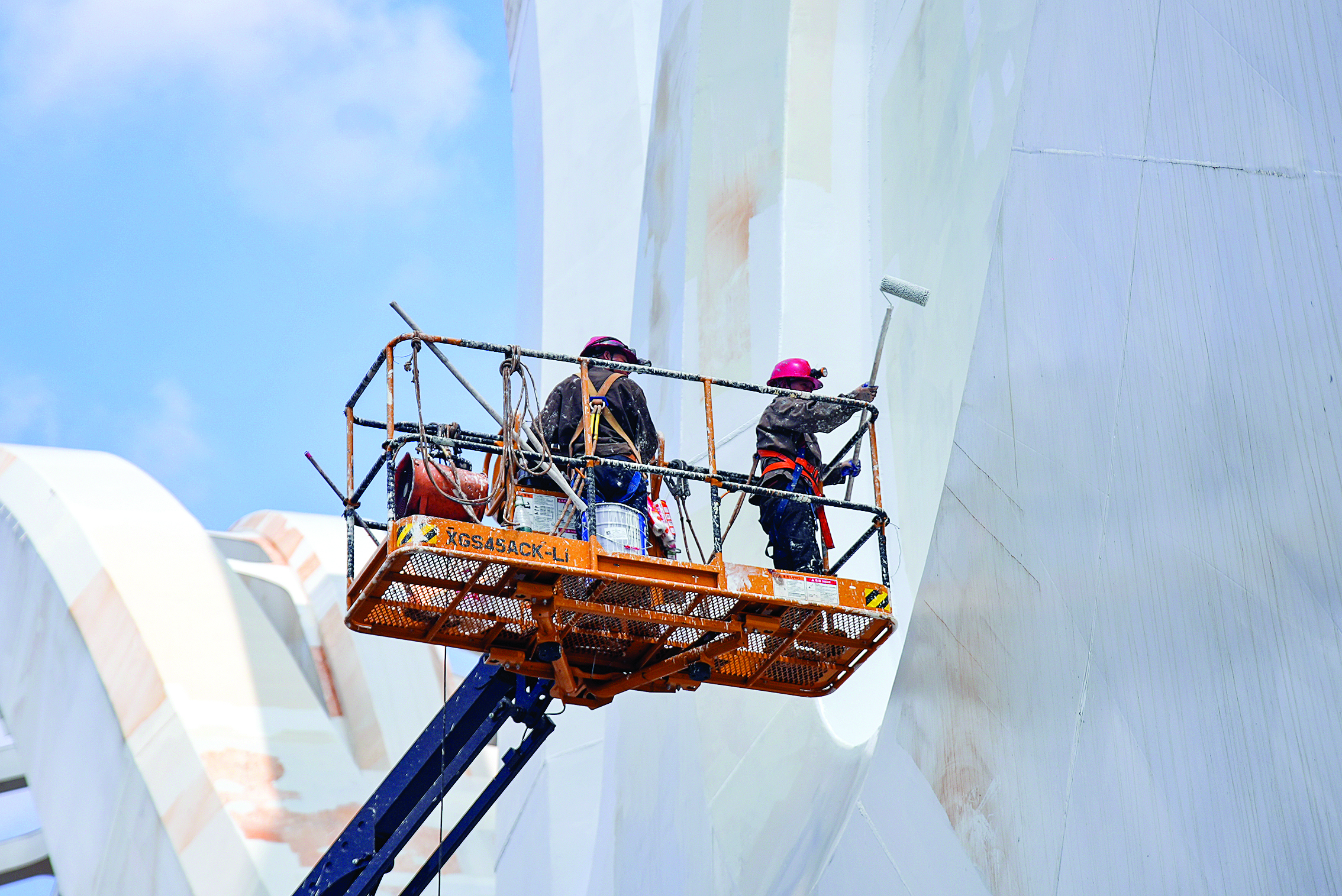工人們正在給鵝城大橋“鵝”身刷漆。惠州日報記者羅劍業(yè) 攝
