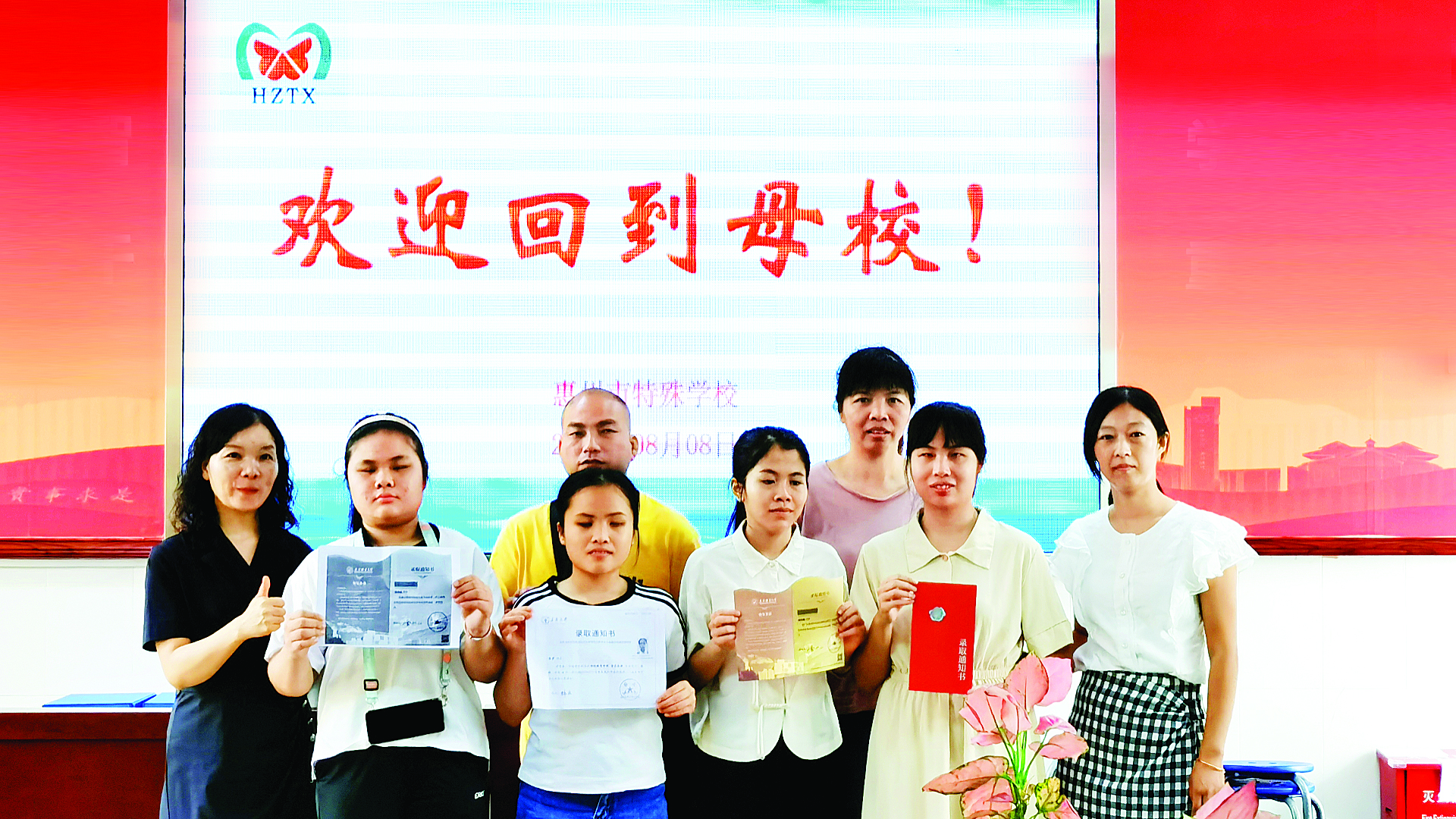 惠州市特殊學(xué)校5位考生在不久前考上了心儀的大學(xué),圖為其中四位同學(xué)和老師、家長合影;葜萑請笥浾哔嚾A海 攝