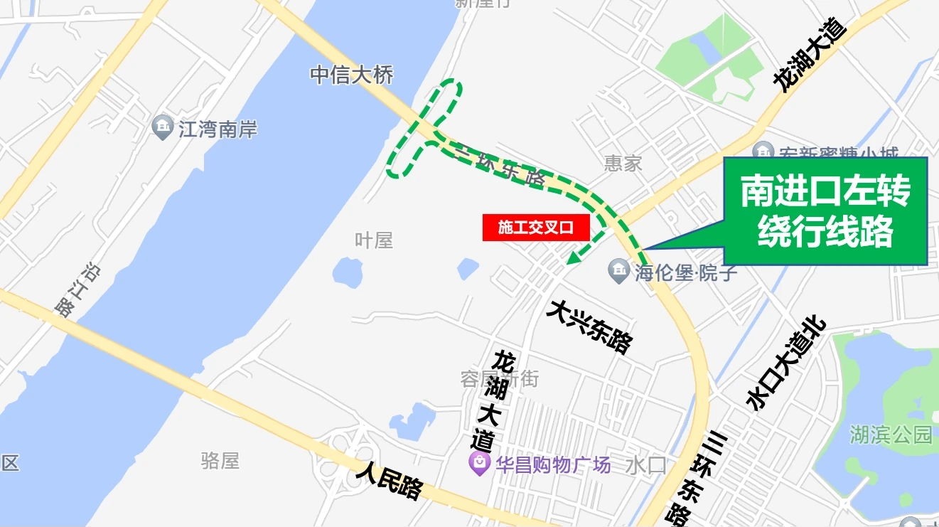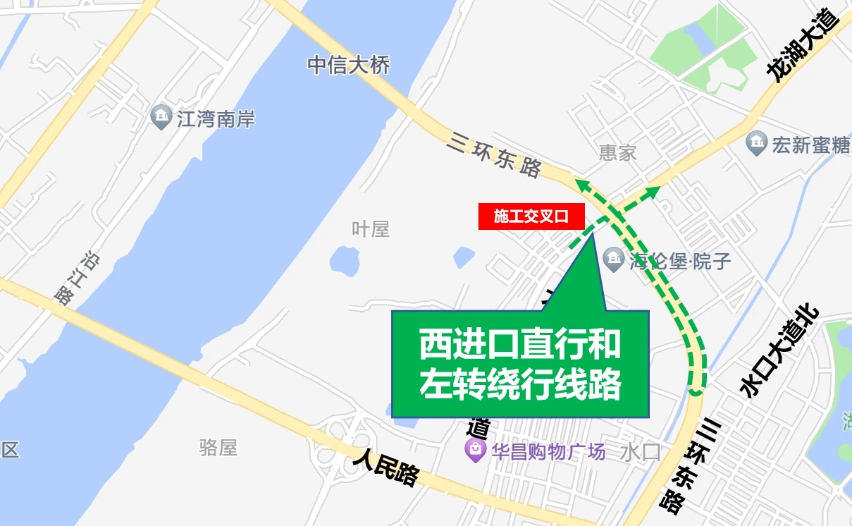 第一階段施工期間,原從東進(jìn)口直行和左轉(zhuǎn)的車輛,可通過三環(huán)東路-龍湖四街-江濱路-龍津二街-三環(huán)東路等道路繞行;原從西進(jìn)口直行和左轉(zhuǎn)的車輛,可通過三環(huán)東路/水口大道北交叉口左轉(zhuǎn)或掉頭繞行;原從北進(jìn)口左轉(zhuǎn)的車輛,可通過三環(huán)東路/水口大道北交叉口左轉(zhuǎn)或掉頭繞行;原從南進(jìn)口左轉(zhuǎn)的車輛,可通過三環(huán)東路-龍湖四街-江濱路-龍津二街-三環(huán)東路-龍湖大道等道路繞行。