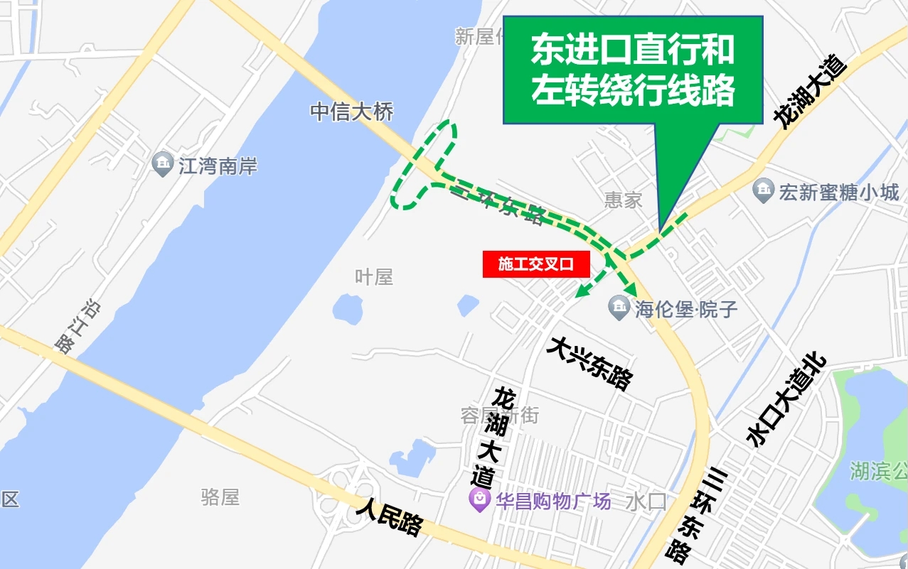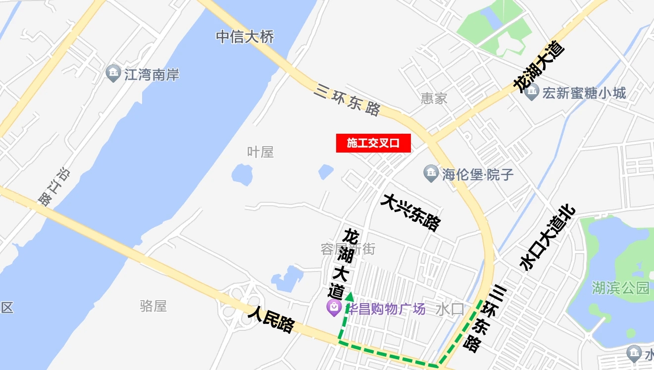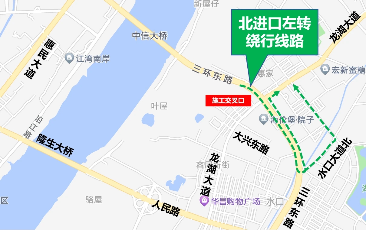 第二階段施工期間,原從東進(jìn)口直行、南進(jìn)口左轉(zhuǎn)、北進(jìn)口右轉(zhuǎn)的車輛,請通過三環(huán)東路/惠澤大道交叉口-人民路-龍湖大道等道路繞行,其余方向按照施工第一階段進(jìn)行繞行。