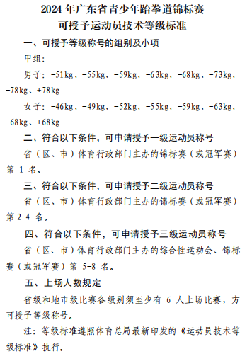 廣東省青少年跆拳道錦標(biāo)賽是年度全省競技水平最高、參賽規(guī)模最大的跆拳道專業(yè)賽事,在比賽(甲組)中取得相應(yīng)成績的運動員可授予國家一級、二級、三級運動員。