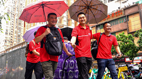 員工志愿者冒著小雨,齊心協(xié)力運送活動飲用水