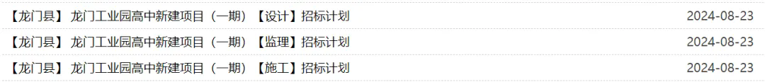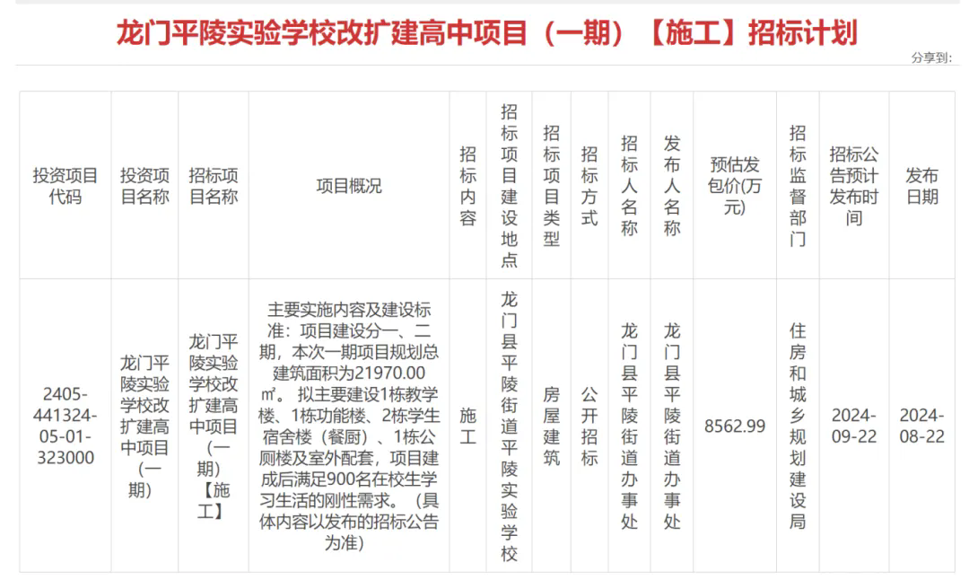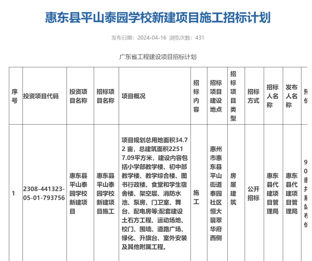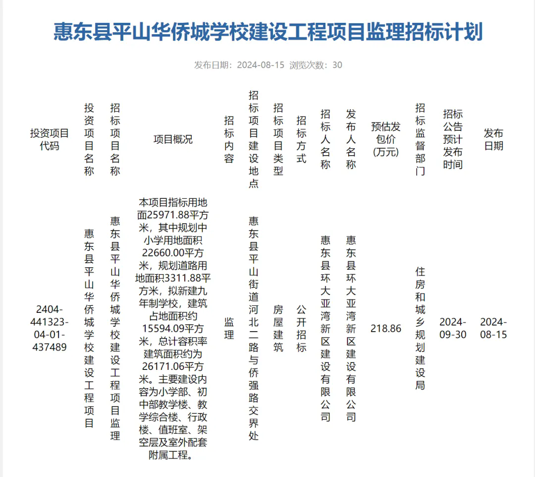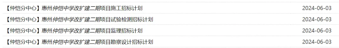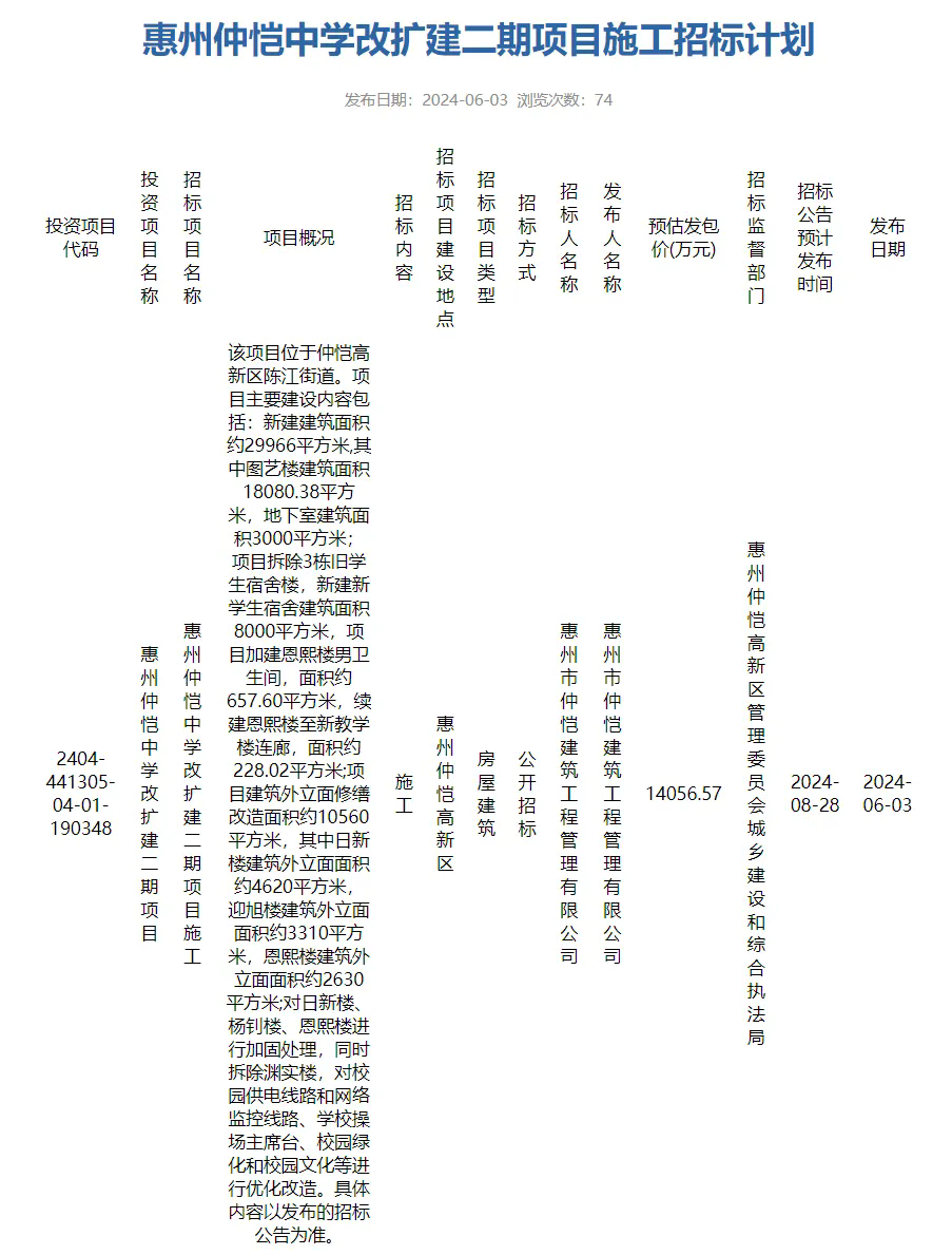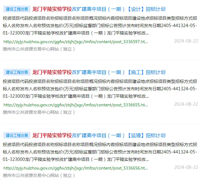 此外,惠州市公共資源交易中心還發(fā)布了龍門平陵實驗學(xué)校改擴建高中項目(一期)設(shè)計、施工和監(jiān)理招標計劃。