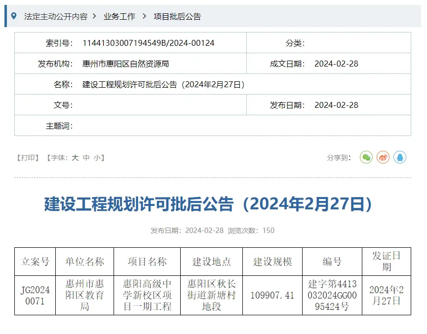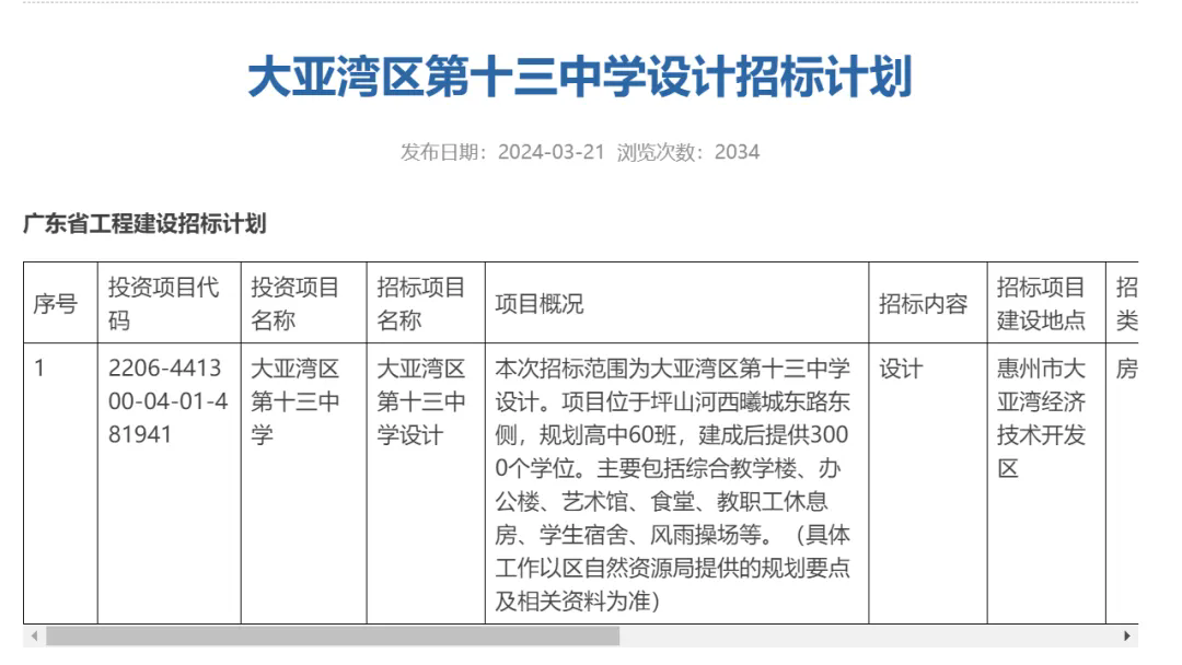 2024年7月,惠州市自然資源局大亞灣分局發(fā)布了《大亞灣第七中學(xué)工規(guī)許可批前公示》。