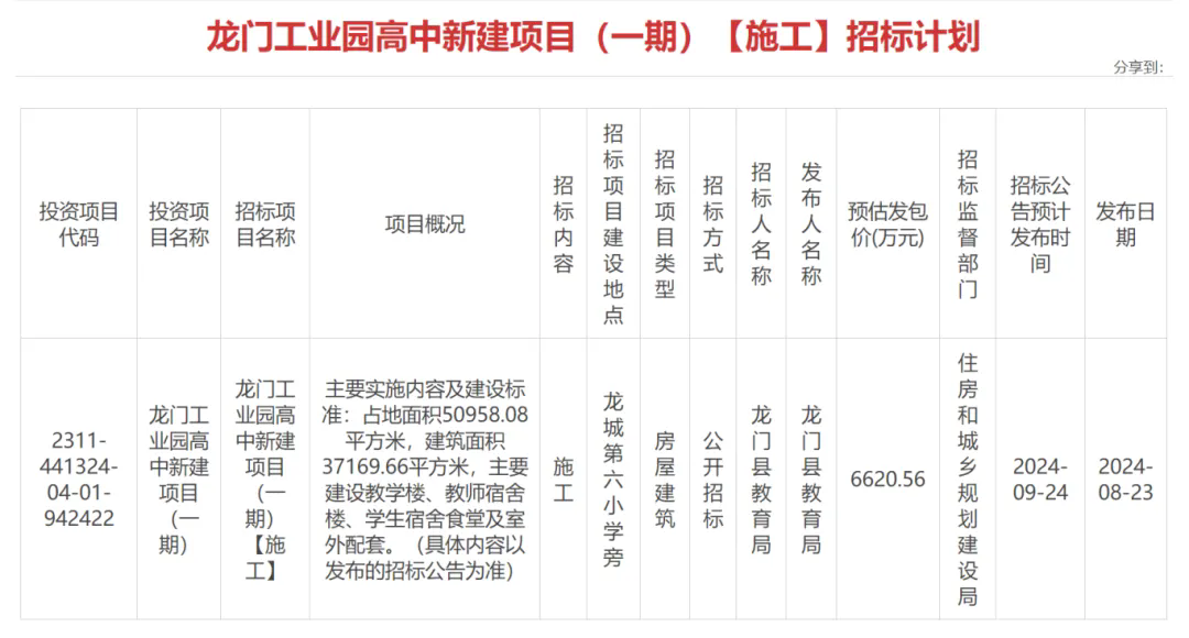 日前,樓叔從惠州市公共資源交易中心獲悉,龍門工業(yè)園高中新建項目(一期)設(shè)計、施工和監(jiān)理招標計劃,意味著龍門將新增一所全新高中。