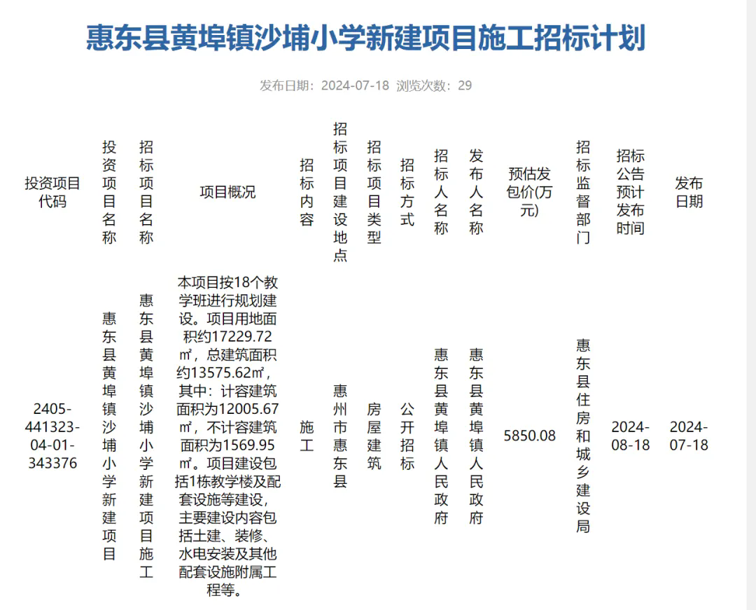 前段時間,惠州市公共資源交易中心發(fā)布惠東縣黃埠鎮(zhèn)沙埔小學(xué)新建項目施工招標計劃。