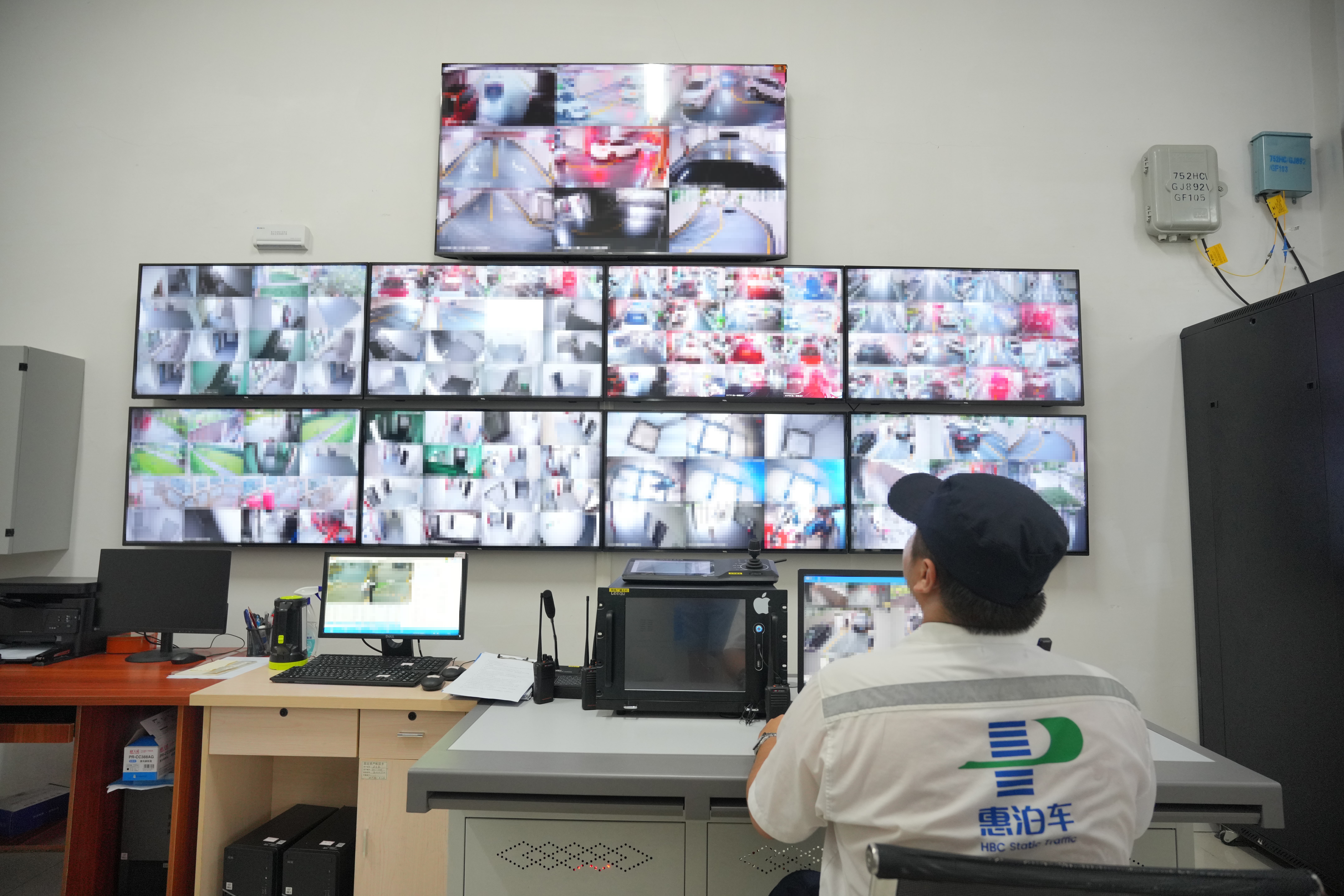 工作人員使用高清監(jiān)控對(duì)停車(chē)場(chǎng)車(chē)輛進(jìn)行引導(dǎo)管理。