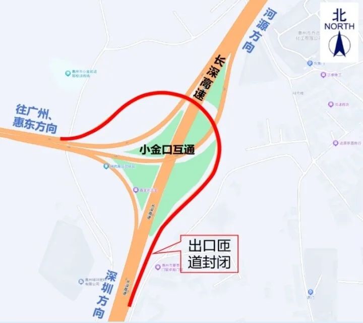 長(zhǎng)深高速公路惠州段(惠河高速公路)小金口樞紐互通南往北出口匝道封閉交通組織示意圖。