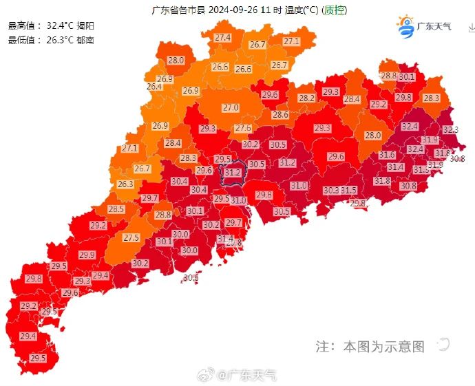 27日,粵北、粵東和珠江三角洲東部市縣多云,局部有(雷)陣雨,其余市縣晴到多云。最高氣溫:粵北市縣29~31℃,其余市縣31~34℃。