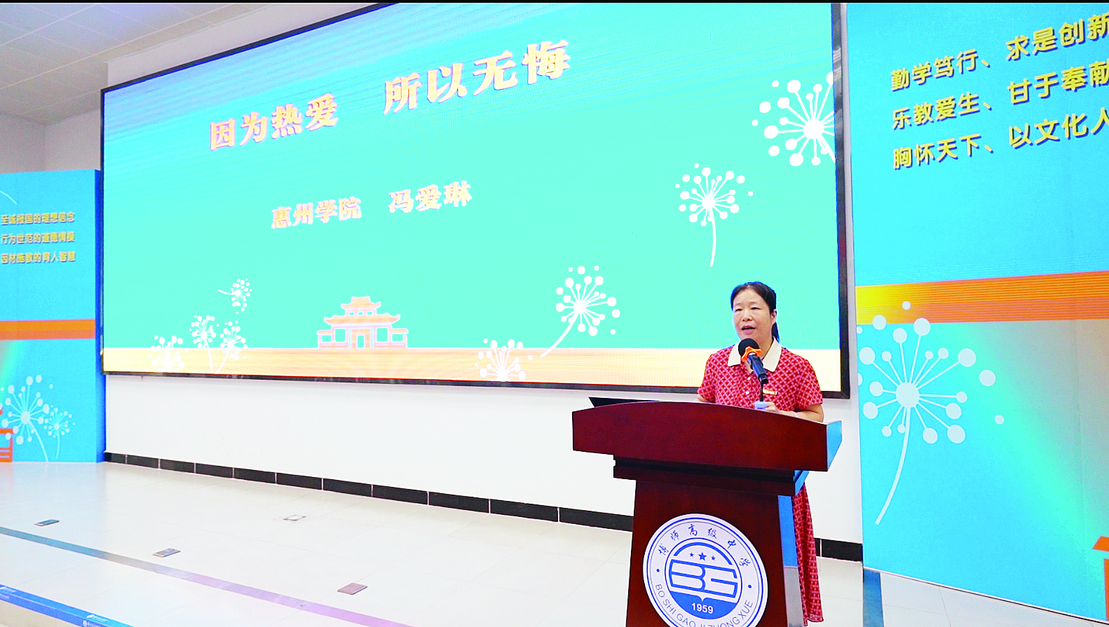 惠州學(xué)院第三屆師德模范、文學(xué)與傳媒學(xué)院副教授馮愛琳作主題報(bào)告。她演講的主題是:因?yàn)闊釔,所以無悔。