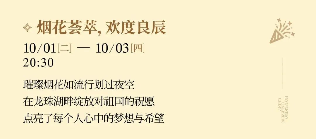 國慶期間,園區(qū)內(nèi)不同時段不同地點(diǎn),將會有水上飛人、夢幻泡影、歡樂喜劇人、樂隊(duì)演出、演藝巡游、露天電影、篝火晚會等豐富多樣的活動。