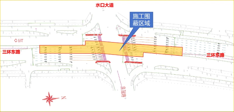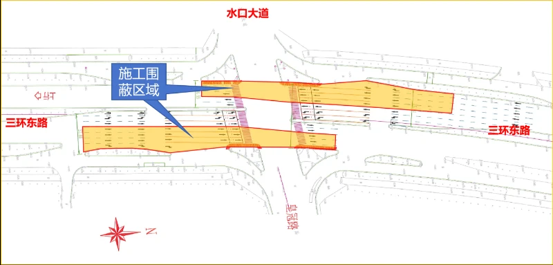 市區(qū)三環(huán)東路/皇冠路交叉口施工期間繞行示意圖。