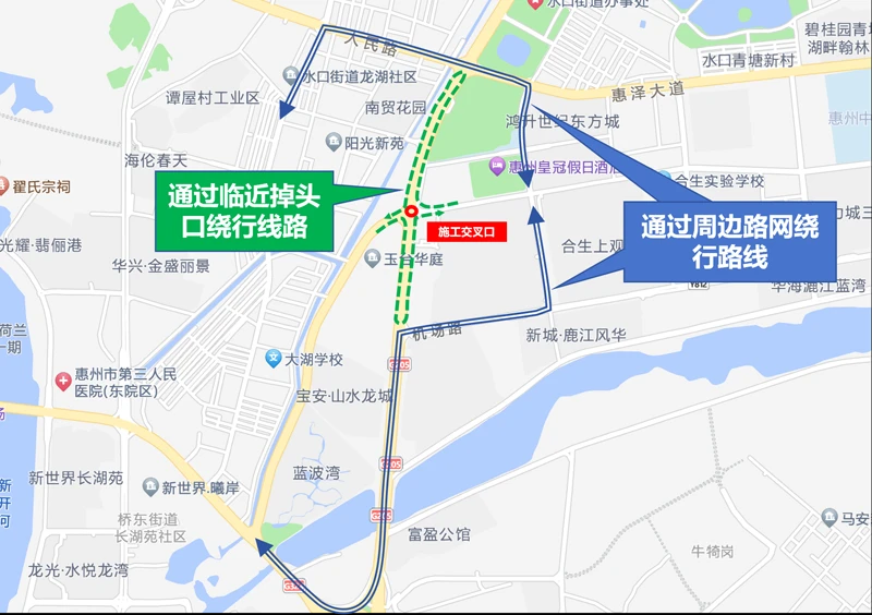 施工期間,原從三環(huán)東路左轉(zhuǎn)往皇冠路、三環(huán)東路左轉(zhuǎn)往水口大道、皇冠路左轉(zhuǎn)往三環(huán)東路、水口大道左轉(zhuǎn)往三環(huán)東路、皇冠路直行往返水口大道的車輛,請通過三環(huán)東路臨近掉頭口掉頭繞行或通過臨近的惠澤大道、機場路、惠州大道等道路繞行(如圖3所示);原從三環(huán)東路/皇冠路交叉口東西向通行的行人,請通過鄰近的三環(huán)東路/惠澤大道交叉口或三環(huán)東路/機場路交叉口的人行橫道通行。