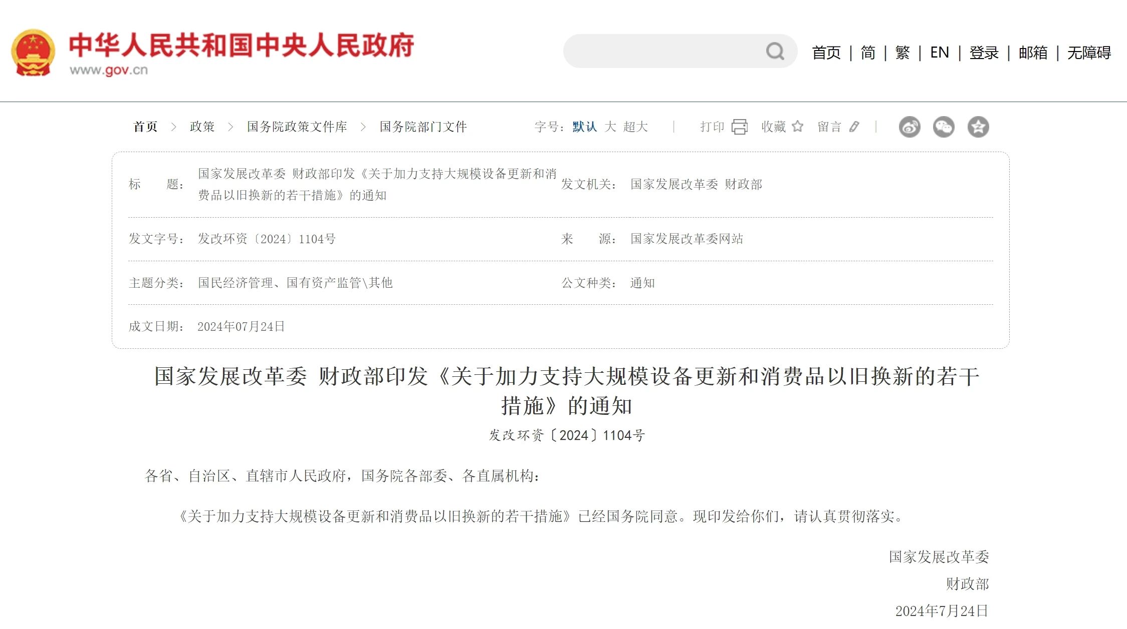 2024年7月24日,國(guó)家發(fā)展改革委、財(cái)政部印發(fā)了《關(guān)于加力支持大規(guī)模設(shè)備更新和消費(fèi)品以舊換新的若干措施》的通知,提出要從今年發(fā)行的特別國(guó)債中,拿出3000億元用于支持設(shè)備更新、消費(fèi)品以舊換新活動(dòng)。
