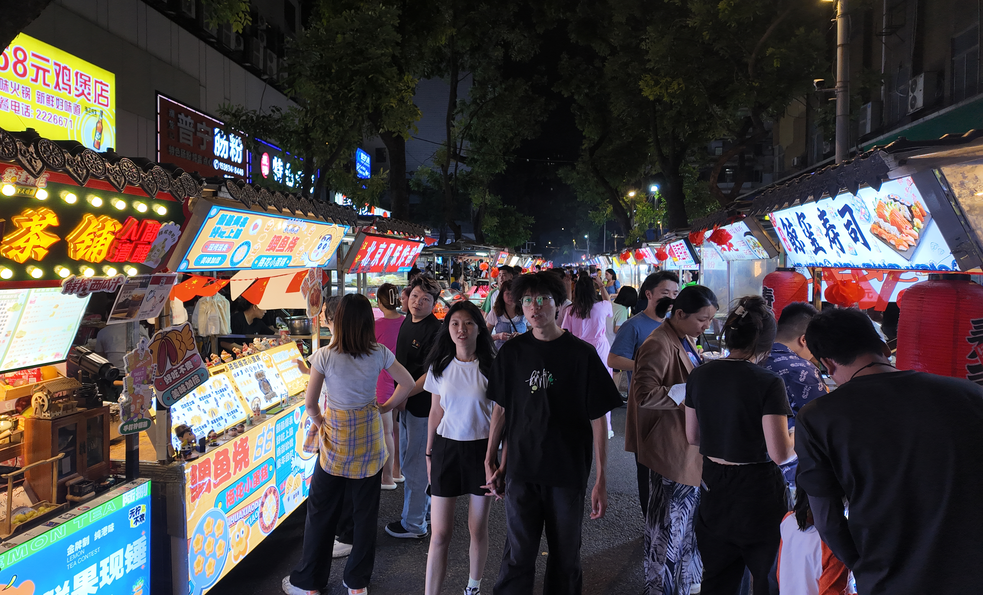 在市區(qū)河南岸小吃街、龍豐夜市,匯聚各式小吃,小龍蝦、鐵板魷魚、鴨脖……這里總有一種美食能讓你胃口大開。這些地方因而成為市民爭相休閑打卡好去處。人頭攢動中,市民消費(fèi)熱情高漲,攤主忙得不亦樂乎。