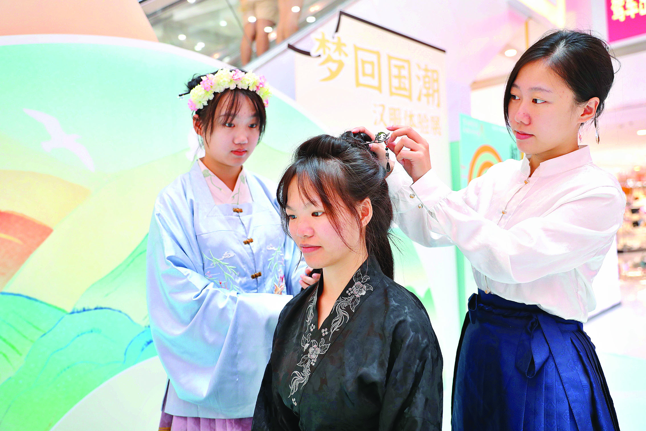 國(guó)潮風(fēng)越吹越濃,年輕人穿起漢服扎起頭發(fā)。