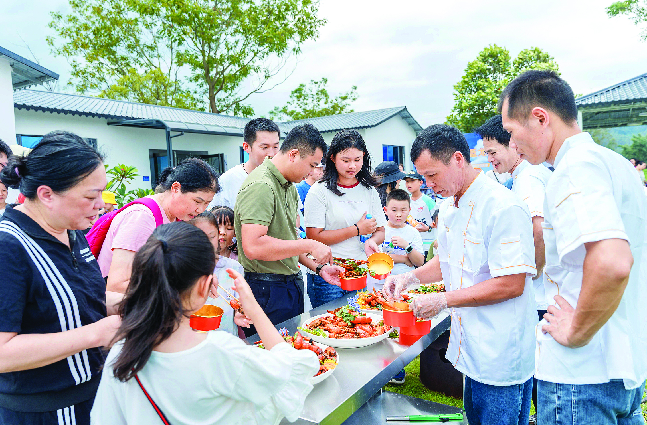 收網(wǎng)、捕蝦、裝筐……一籠籠個(gè)頭肥美的藍(lán)龍蝦從水塘里打撈而出,隨后由大廚們現(xiàn)場烹飪,為游客送去獨(dú)特的味蕾盛宴。