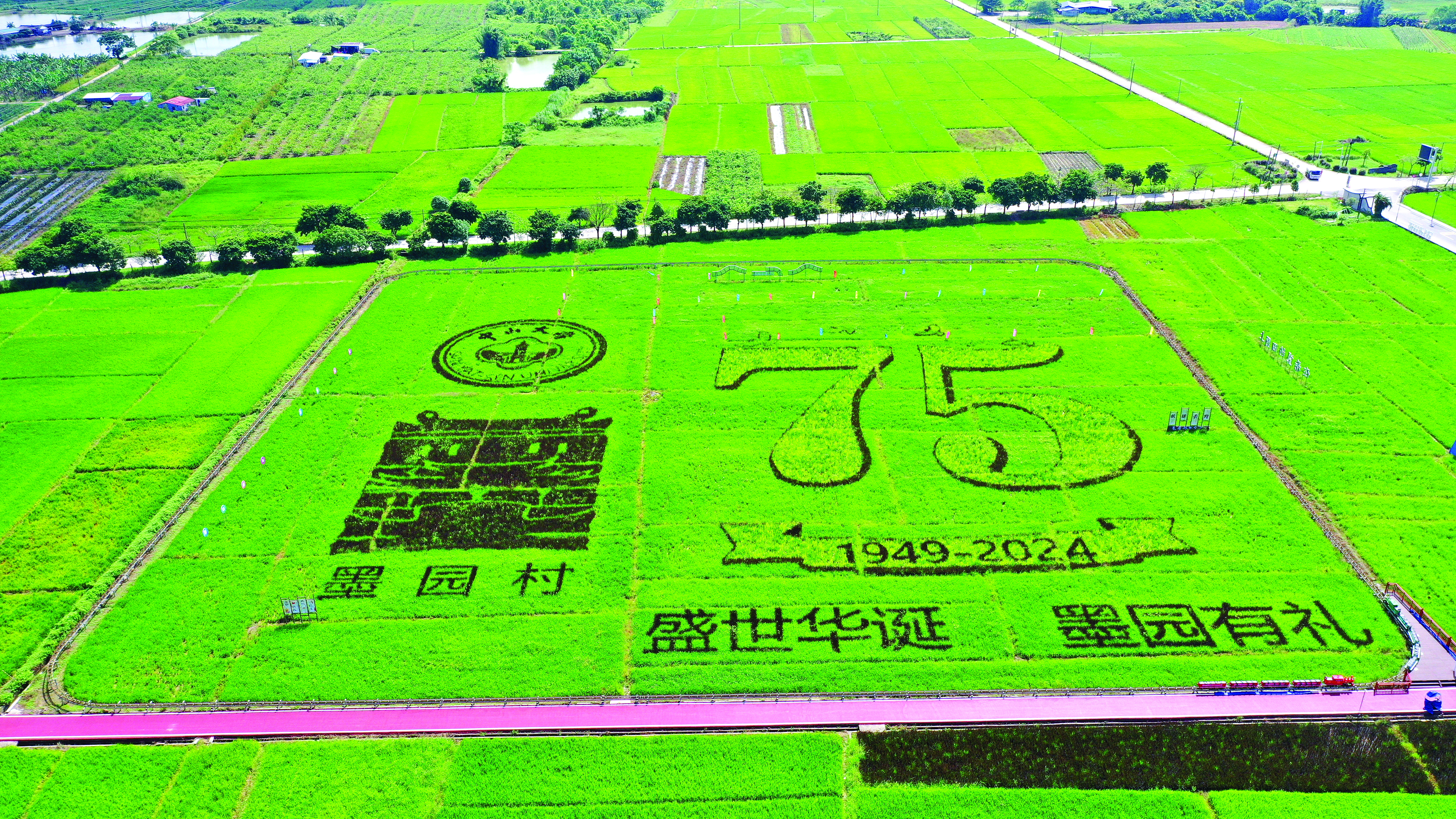 從高空俯瞰,一副巨型的由黑米與大米混合種植的“稻田畫”躍然田野上。約30畝的田園上,偌大的“75”造型寓意新中國成立以來的崢嶸歲月,旁邊由村里古建筑組合勾畫出的“墨園”文創(chuàng)村印赫然顯現(xiàn),“盛世華誕 墨園有禮”八個(gè)稻田字更是反映了墨園村民對(duì)國家興盛、鄉(xiāng)村振興的喜悅之情。