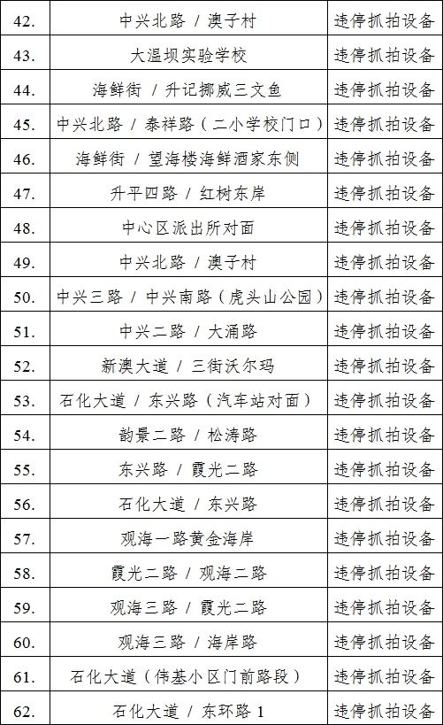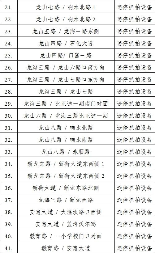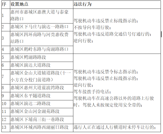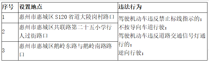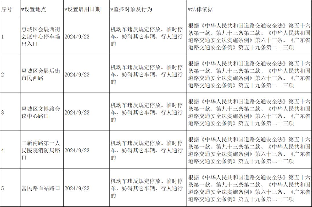 根據(jù)《中華人民共和國行政處罰法》第四十一條及《道路交通安全違法行為處理程序規(guī)定》第十六條關(guān)于“固定式交通技術(shù)監(jiān)控設(shè)備地點應(yīng)向社會公布”的規(guī)定,惠州市轄區(qū)范圍內(nèi)近期啟用的視頻監(jiān)控點位公布,具體如下: