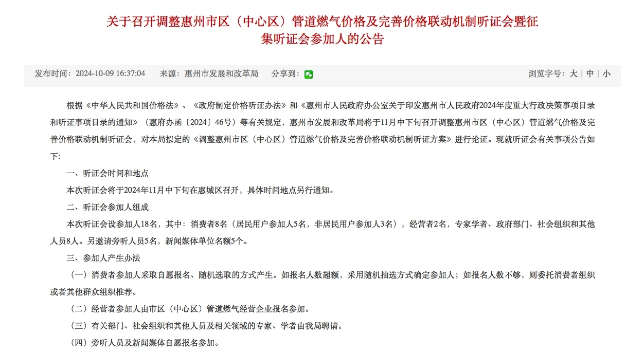 市發(fā)展改革局相關(guān)負(fù)責(zé)人介紹,聽證會(huì)將于2024年11月中下旬在惠城區(qū)召開,具體時(shí)間地點(diǎn)另行通知。屆時(shí)將設(shè)18名聽證會(huì)參加人員,分別為消費(fèi)者8名,其中居民用戶參加人5名,非居民用戶參加人3名;經(jīng)營者2名;專家學(xué)者、政府部門、社會(huì)組織和其他人員8名。另邀請(qǐng)旁聽人員5名,并設(shè)新聞媒體單位名額5個(gè)。參加人員報(bào)名時(shí)間為10月10日至21日。