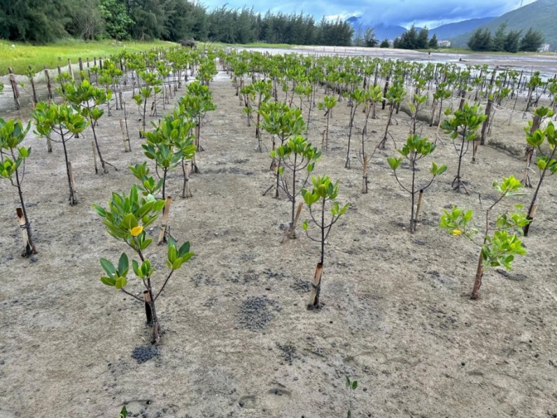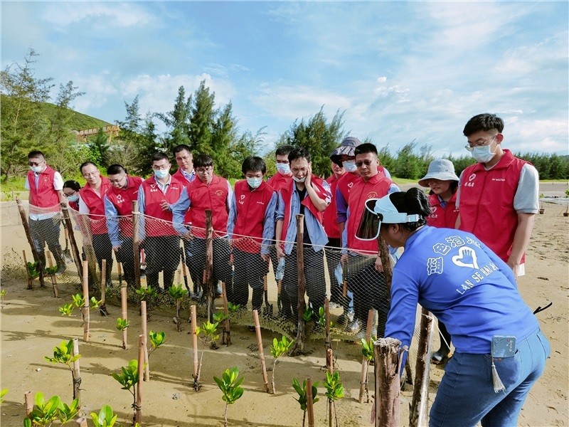 2021年4月22日,藍(lán)色海灣公益協(xié)會(huì)志愿者與惠州核電青年團(tuán)員,在煙墩嶺下近400平方米的灘涂濕地上,挖坑基、打樁、固定綁扎苗,共同種下了600多株秋茄(紅樹林的常見品種),并將此處命名為“惠核青年林”。