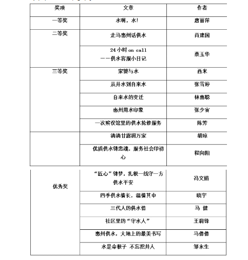 活動(dòng)共征集近300篇優(yōu)秀作品,涵蓋通訊、散文、回憶錄、隨筆等,最終由專家評(píng)審團(tuán)評(píng)選出獲獎(jiǎng)作品!端,水!》《走馬惠州話供水》《24小時(shí)on call——供水客服小日記》……一篇篇優(yōu)秀征文作品,傾注了作者的真情實(shí)感,以樸實(shí)的語言和生動(dòng)的細(xì)節(jié),反映在黨和國(guó)家領(lǐng)導(dǎo)下建設(shè)中國(guó)特色社會(huì)主義偉大事業(yè)和惠州供水事業(yè)的成果。