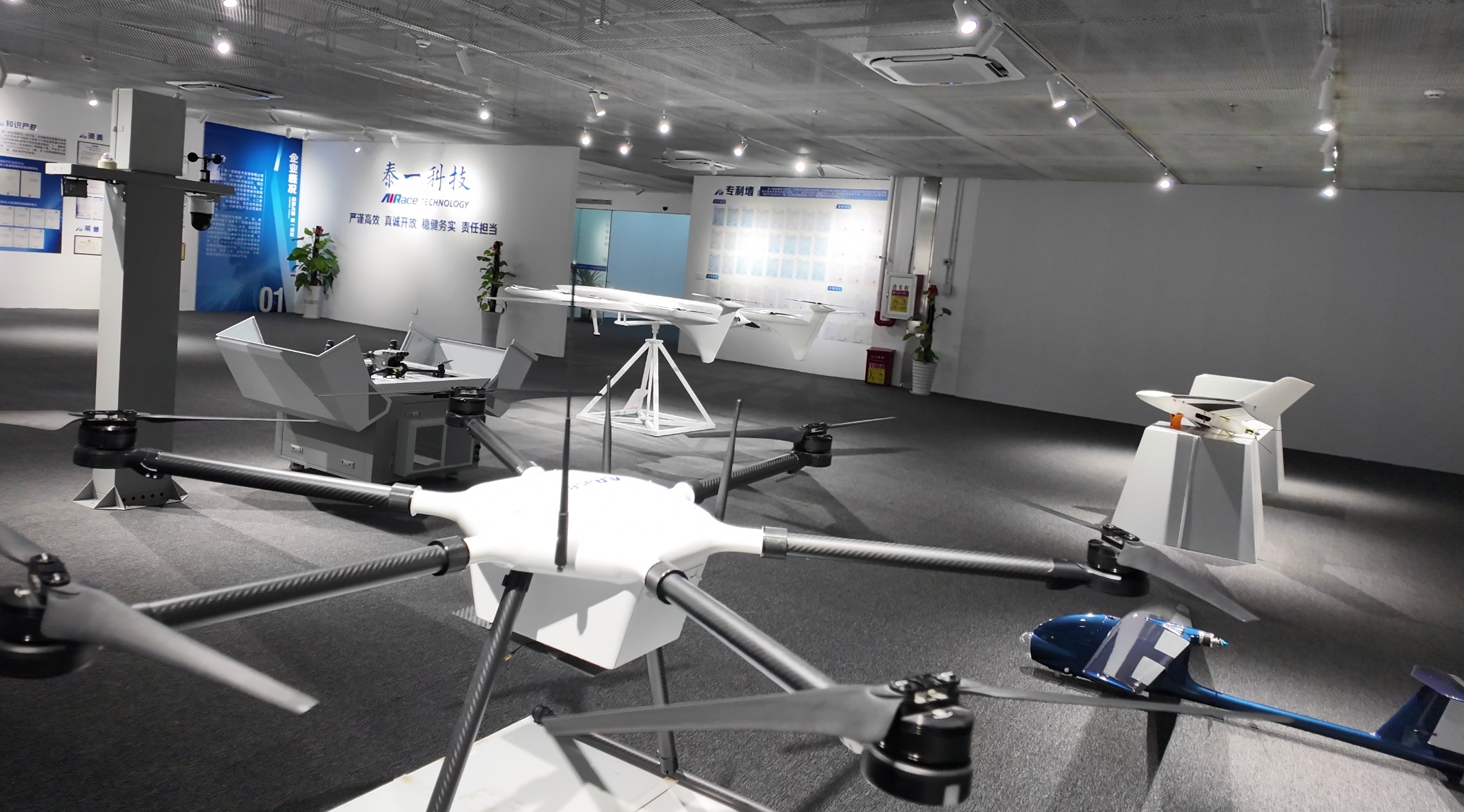廣東泰一高新技術(shù)發(fā)展有限公司展廳內(nèi)的行業(yè)無人機(jī);葜輺|江圖片社供圖