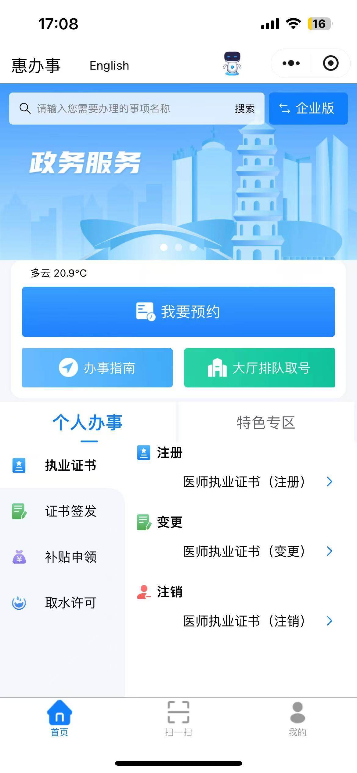 在微信小程序搜索“惠辦事”,便能找到“惠辦事”小程序,點擊進入,只見頁面清新簡潔,“我要預約”“辦事指南”“大廳排隊取號”“個人辦事”“特色服務”,五大主要模塊清晰顯眼。