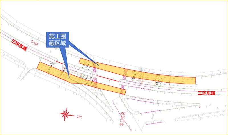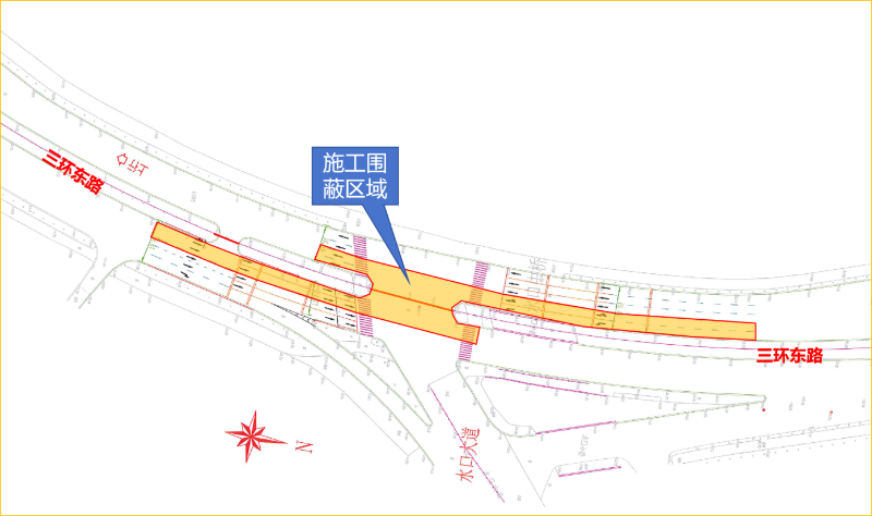 其中第一階段三環(huán)東路/水口大道(北段)交叉口南北向外側(cè)6車道封閉,內(nèi)側(cè)4車道可直行;南進口禁止車輛右轉(zhuǎn);東進口及北進口禁止車輛左轉(zhuǎn);東西向人行橫道禁止行人通行,第二階段:三環(huán)東路/水口大道(北段)交叉口南北向內(nèi)側(cè)4車道封閉,外側(cè)6車道恢復(fù)通行;東進口及北進口禁止車輛左轉(zhuǎn);東西向人行橫道禁止行人通行。