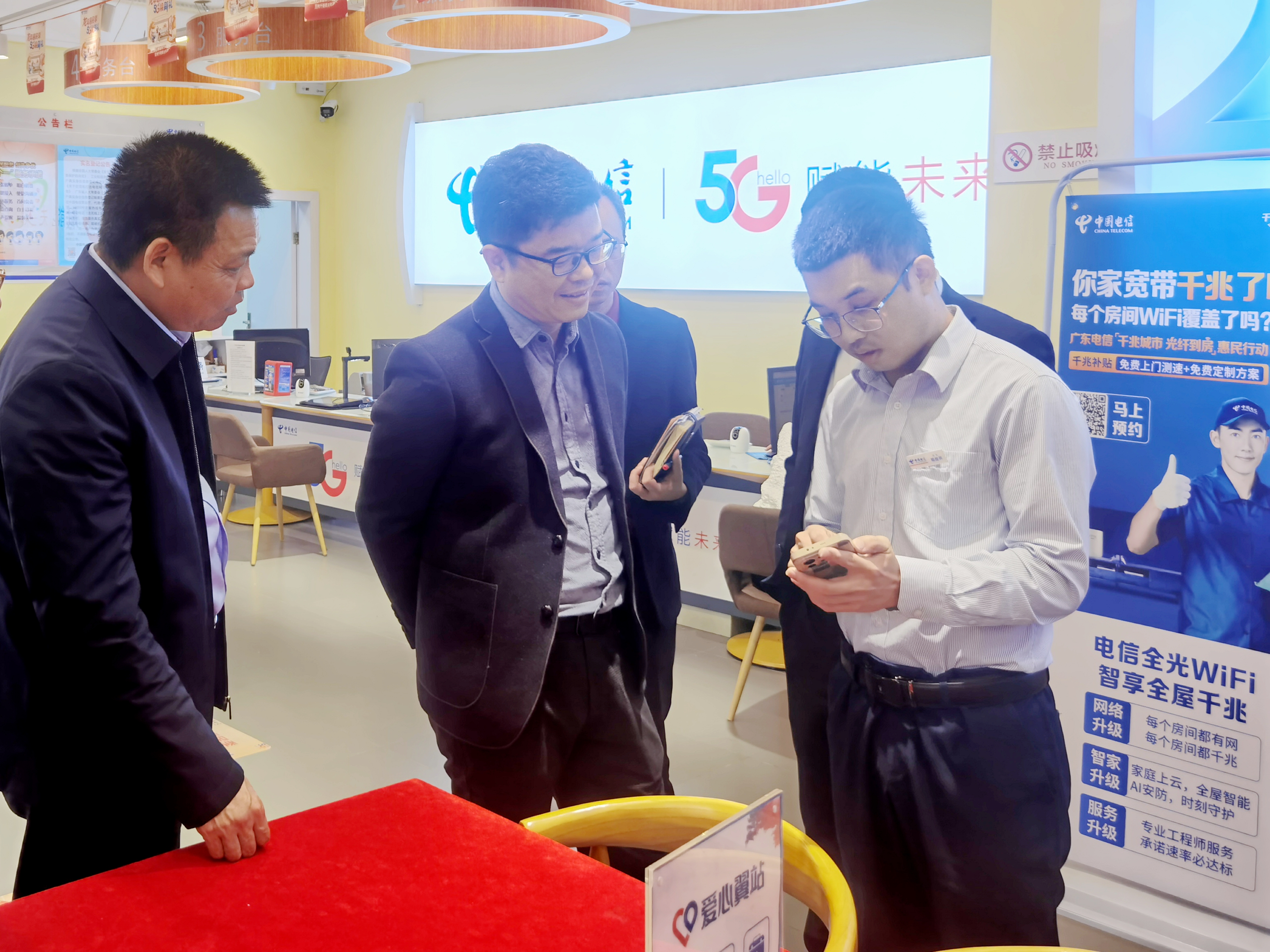 惠州電信黨委書記、總經(jīng)理簡(jiǎn)冠毅(中)調(diào)研電信“數(shù)智隨心”服務(wù)舉措落實(shí)情況。