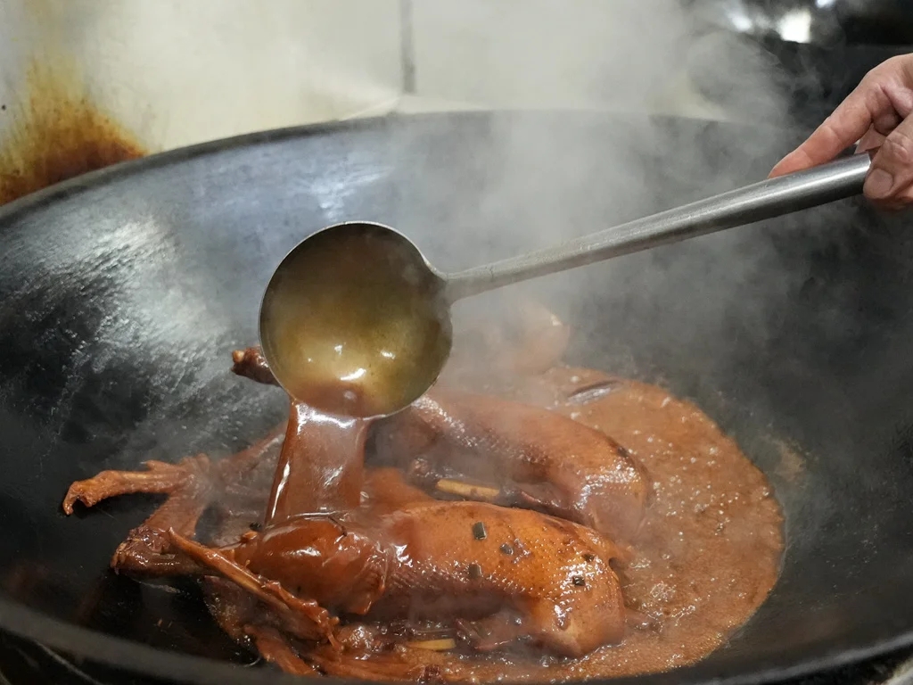 張旭輝用醬油給鵝做了個全身SPA,接著把鵝放進油鍋用小火煎至金黃,煎好后將鵝盛起,把大蒜、八角、豆豉、南乳等配料放進鍋爆炒,再放入鵝,加水用大火燜二十分鐘,隨后改小火燜約一小時!罢麄過程最根本的還是不斷翻動的手藝。當水快燒干時,金黃色的鵝變成深紅色,就可以把鵝撈起來裝進盤里了。”張旭輝說,這時候,鍋內(nèi)剩下的配料汁也不浪費,將其淋遍鵝的全身,一道美味的“瀝林碌鵝”便新鮮出爐了,深紅色的鵝散發(fā)出香味,讓人垂涎欲滴。淺嘗一口,碌鵝入口香味濃郁,細嚼鵝肉細嫩多汁,讓人回味無窮。