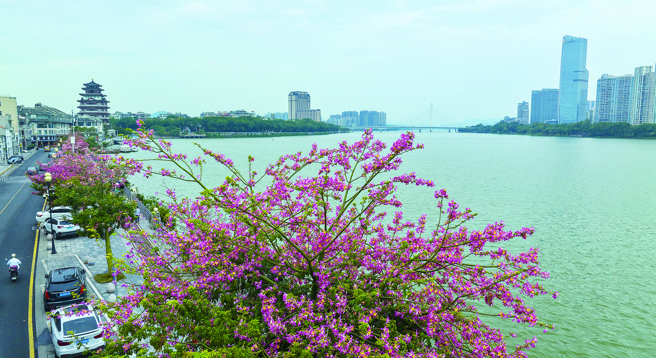 近日,惠州市區(qū)水東街的美麗異木棉進入盛花期,滿樹姹紫嫣紅,粉色的小花在蜿蜒的枝條上綻放,宛若靈動飛舞的蝴蝶,吸引不少路人駐足賞花,打卡拍照。