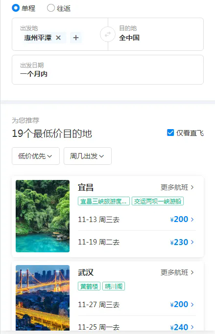 未來一個月惠州直飛多地機(jī)票