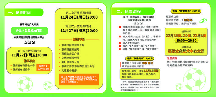 賽事三輪搶票時間及渠道分別為:11月22日(周五)20:00,第一次開放搶票鏈接,通過惠州發(fā)布微信公眾號、視頻號平臺發(fā)放5000張門票;第二、三次開放搶票鏈接,分別是在11月24日、11月27日20:00,通過惠州日報微信公眾號、視頻號,惠州頭條客戶端,文明惠州視頻號,美好惠州抖音號,惠州文體旅游發(fā)布微信公眾號,文惠圈小程序等平臺發(fā)放剩余門票。通過上述媒體平臺,市民可掃碼進入搶票小程序,填寫相關身份信息后進行搶票,先到先得,搶完即止。