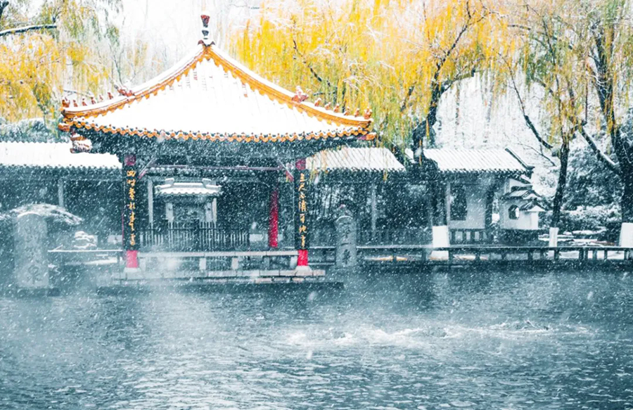趵突泉,天下第一泉,池內(nèi)三股泉水從地下石灰?guī)r溶洞中噴涌而出,水涌若輪,氣勢磅礴。泉水一年四季恒定在18℃左右,嚴冬時,水面上水汽裊裊,像一層薄薄的煙霧,將趵突泉裝點得如詩如畫,仿佛踏入了一個夢幻般的仙境,這一景觀被當?shù)厝朔Q為 “云蒸霧潤”。
