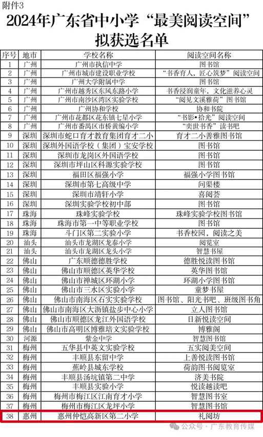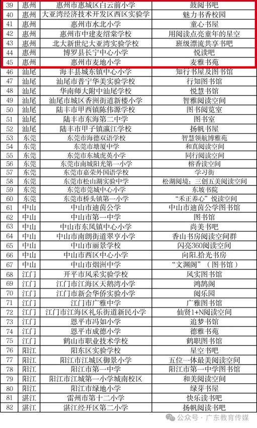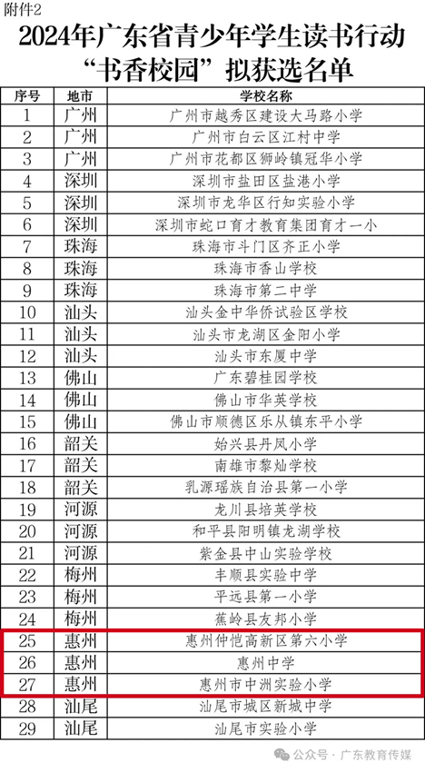 根據(jù)教育部辦公廳《關(guān)于開(kāi)展2024年全國(guó)青少年學(xué)生讀書(shū)行動(dòng)區(qū)域優(yōu)秀案例征集活動(dòng)的通知》(教基廳函〔2024〕30號(hào))和《廣東省教育廳關(guān)于開(kāi)展2024年廣東省中小學(xué)“書(shū)香校園”建設(shè)系列活動(dòng)的通知》精神,經(jīng)組織專家嚴(yán)格評(píng)審,擇優(yōu)遴選出2024年廣東省青少年學(xué)生讀書(shū)行動(dòng)區(qū)域優(yōu)秀案例5個(gè)擬推薦教育部;“書(shū)香校園”61所(其中,惠州有3所);2024年廣東省中小學(xué)“最美閱讀空間”120個(gè)(其中,惠州有8個(gè))。現(xiàn)將名單予以公示,公示期為2024年11月20日至2024年11月27日。