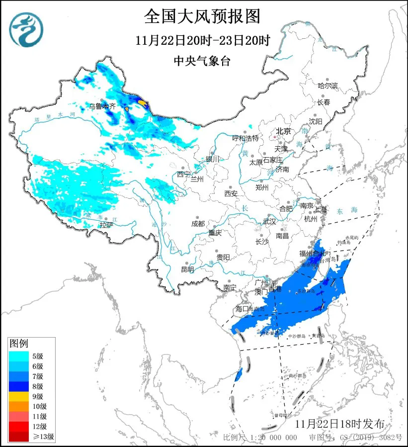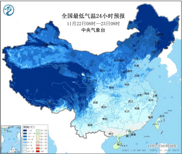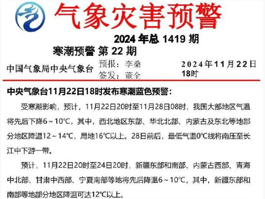 中央氣象臺(tái)11月22日18時(shí)發(fā)布寒潮藍(lán)色預(yù)警和大風(fēng)藍(lán)色預(yù)警。