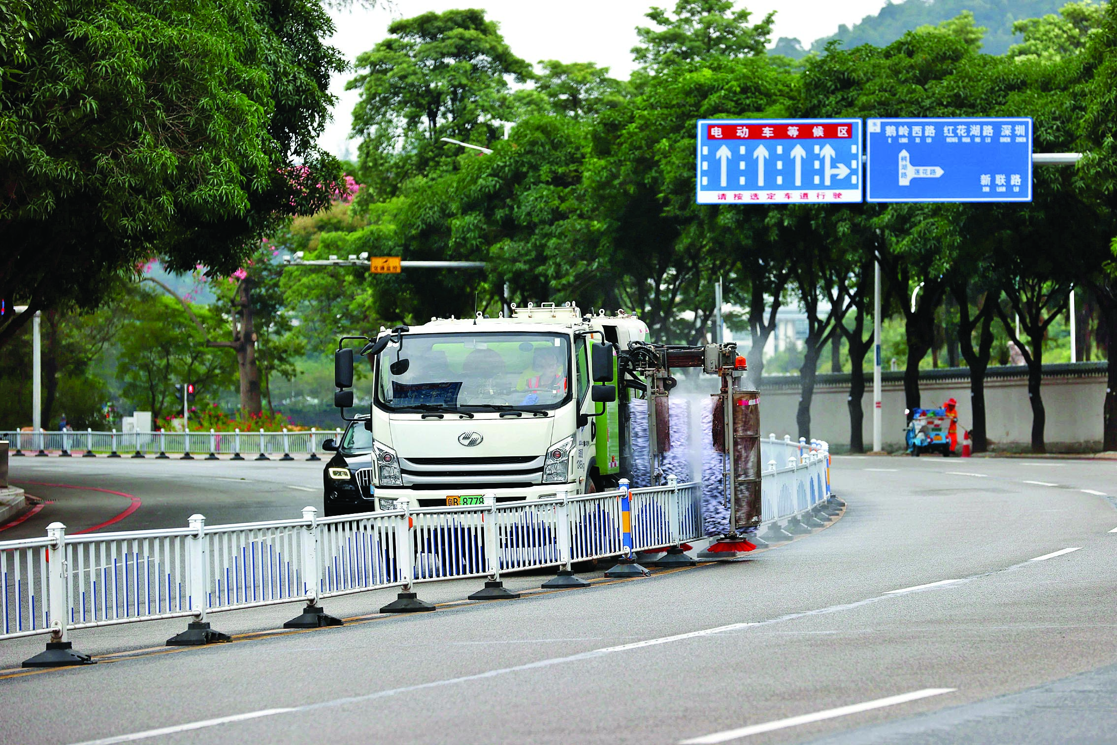 清潔車(chē)在清洗護(hù)欄;葜萑?qǐng)?bào)記者楊建業(yè) 攝