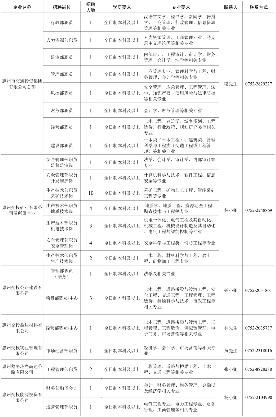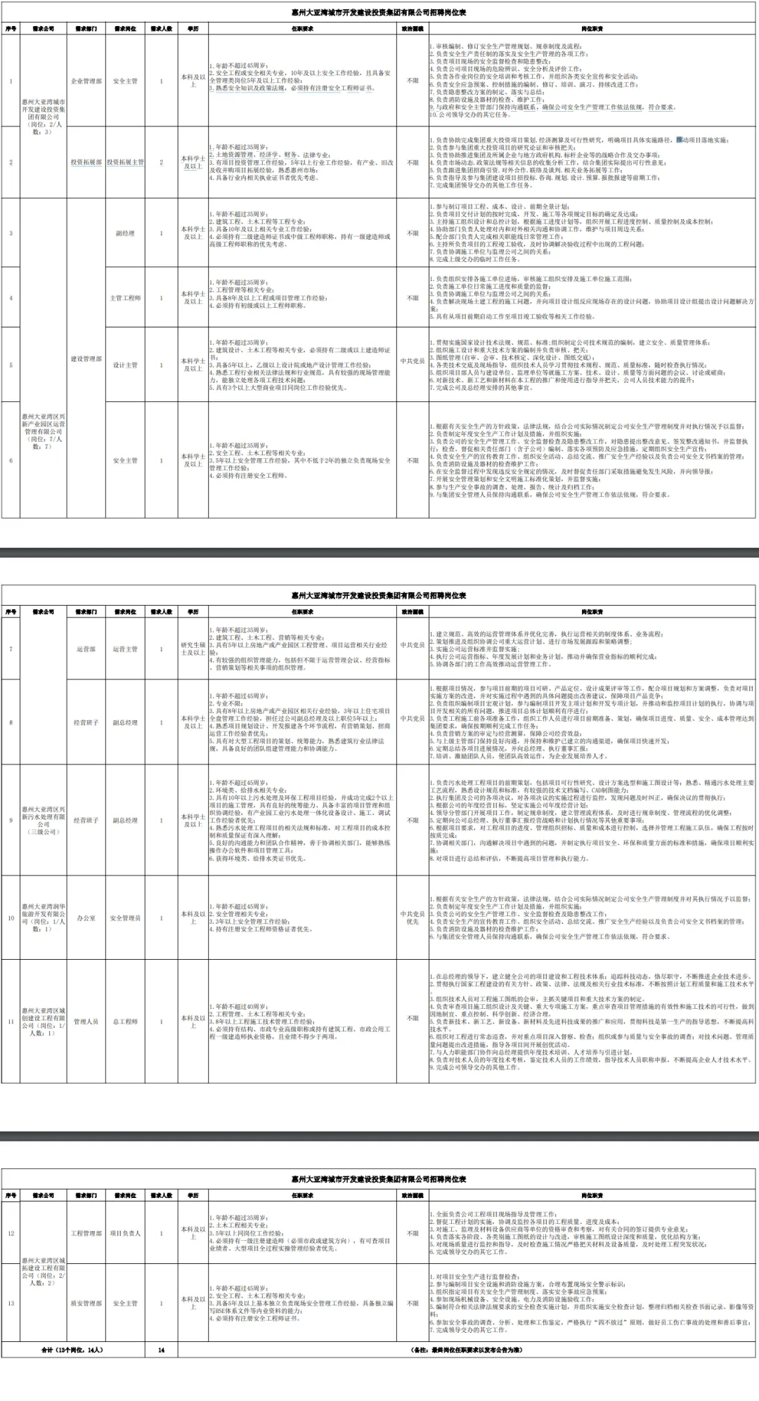 本次招聘工作人員不超過(guò)14名,具體招聘崗位、招聘人數(shù)、崗位職責(zé)及任職條件詳見(jiàn)《惠州大亞灣城市開(kāi)發(fā)建設(shè)投資集團(tuán)有限公司招聘崗位表》。
