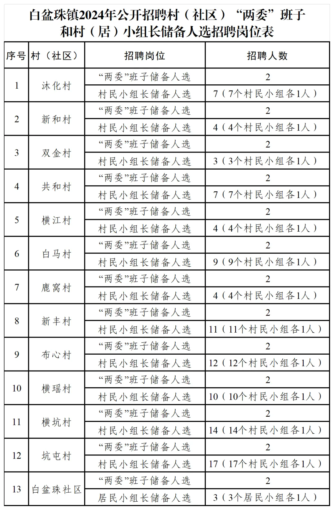 本次招聘村(社區(qū))“兩委”班子儲(chǔ)備人選職位26個(gè),村(居)民小組長(zhǎng)儲(chǔ)備人選職位105個(gè)。