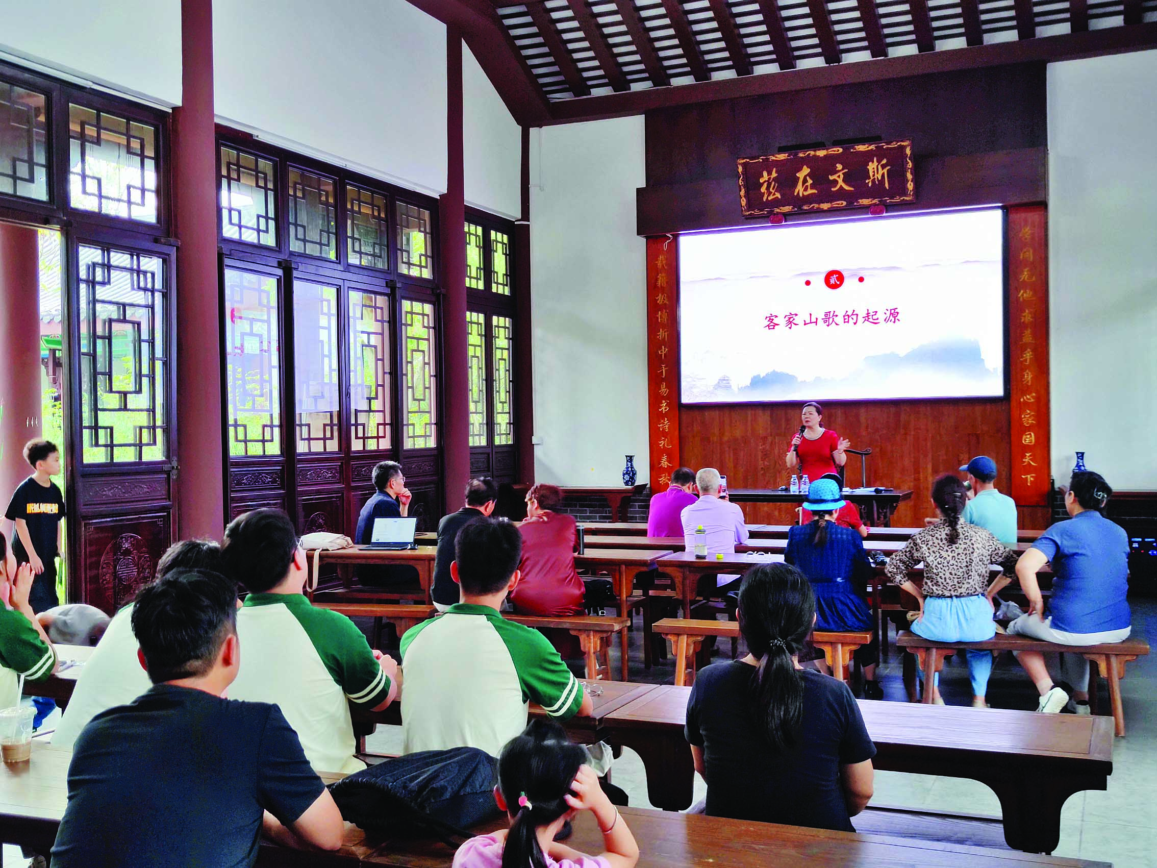 黃紅英在講座中從客家人的來(lái)源、歷史文化說(shuō)起,簡(jiǎn)要介紹了客家山歌的起源和發(fā)展歷程?图疑礁枋侵袊(guó)民歌體裁中山歌類的一種,用客家方言演唱,被稱為有《詩(shī)經(jīng)》遺風(fēng)的天籟之音,它繼承了《詩(shī)經(jīng)》中的傳統(tǒng)風(fēng)格,受到唐詩(shī)律絕和竹枝詞的重大影響,同時(shí)又吸取了南方各地民歌的優(yōu)秀成分,千百年來(lái),廣泛流傳,久唱不衰。