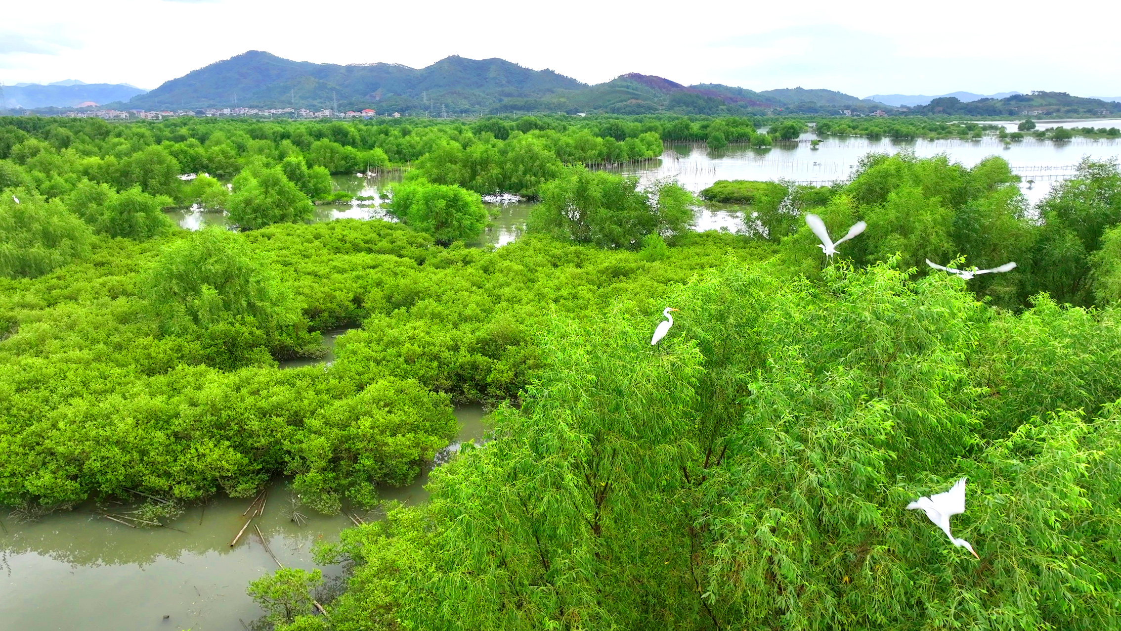 紅樹林內(nèi)鷺鳥起舞。如今,考洲洋生態(tài)環(huán)境逐漸好轉(zhuǎn),水質(zhì)均值符合Ⅱ類海水水質(zhì)標準;葜萑請笥浾邚埶嚸 攝