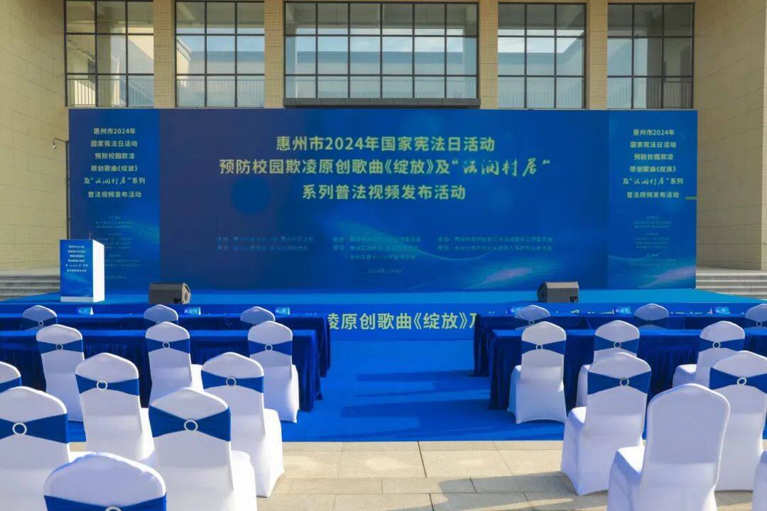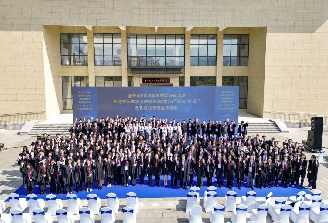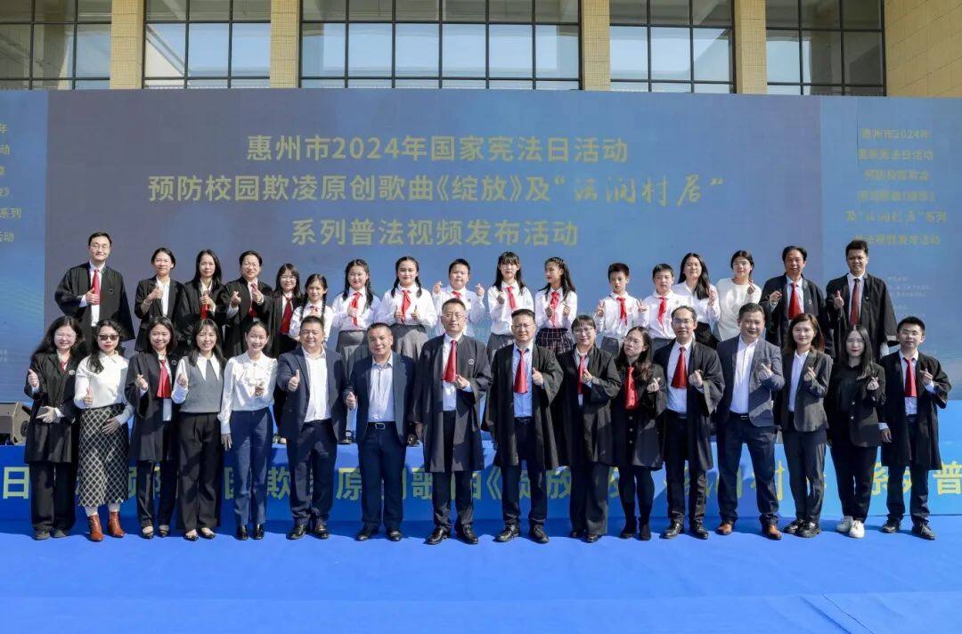 在第十一個(gè)國(guó)家憲法日,惠州市律師協(xié)會(huì)預(yù)防校園欺凌原創(chuàng)歌曲、“法潤(rùn)村居”系列普法視頻發(fā)布活動(dòng)在惠州市青少年法治教育基地隆重舉行。此次活動(dòng)由市普法辦公室、市司法局、市教育局以及市律師協(xié)會(huì)共同主辦。市律師行業(yè)黨委專職副書(shū)記謝峰、普法與依法治理科科長(zhǎng)余雨植,惠城區(qū)司法局,惠州市、惠城區(qū)教育局,市律師協(xié)會(huì)等單位相關(guān)負(fù)責(zé)人,以及160余名惠州執(zhí)業(yè)律師、第十一小學(xué)金榜分校部分師生參加活動(dòng)。