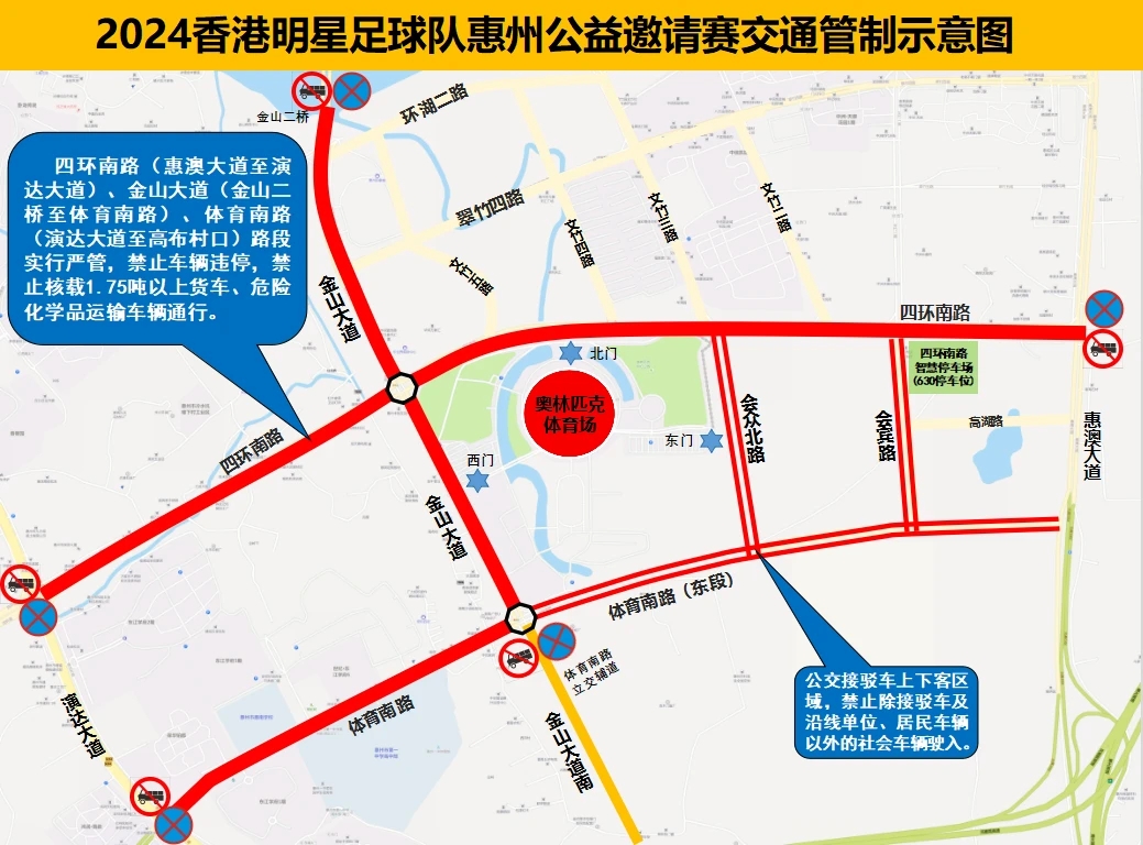 惠州日報訊 (記者龔妍 劉豪偉 特約通訊員鐘楨)12月15日,“惠民之州 惠聚美好”香港明星足球隊惠州公益邀請賽將在惠州奧林匹克體育場舉辦。為做好比賽期間的交通安全保障工作,12月15日11∶30至19∶30,惠城區(qū)部分道路將實施臨時交通管制措施。賽事當天,市區(qū)將設(shè)置6個免費公交接駁點,觀眾可搭乘公交車前往觀賽。