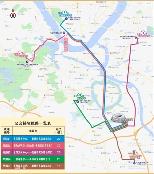 賽事當天,市區(qū)設(shè)置6個免費公交接駁點,江北街道2個,為市民服務(wù)中心、東江公園停車場;水口街道1個,為水口文化體育中心停車場;龍豐街道1個,為高榜山停車場;河南岸街道1個,為惠港中學(xué)停車場;三棟鎮(zhèn)1個,為文思一路(惠州南高鐵站)。接駁公交統(tǒng)一出發(fā)時間為12∶00~14∶00,賽事結(jié)束返程,接駁線去程途中不設(shè)?空军c,返程沿途公交站點可響應(yīng)式?肯驴。